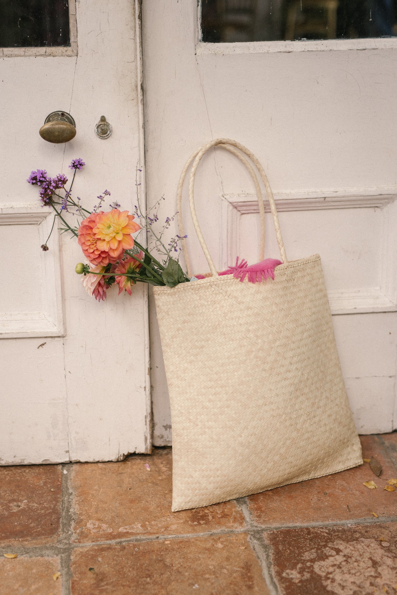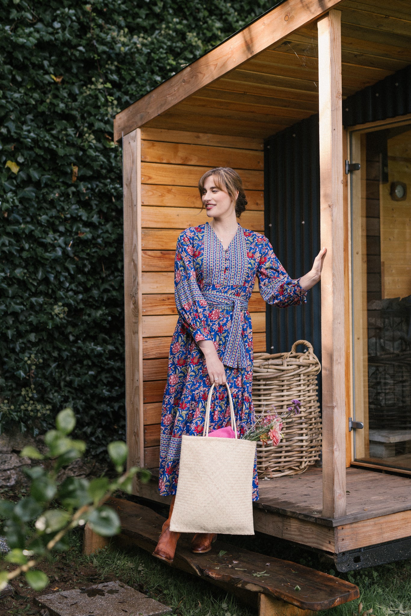This basket bag is destined for dreamy summer days. Hand-crafted from woven raffia, this small style is worked to a squared flat shape, making her the ideal holiday basket to pack. She has navy and orange diagonal stripes hand woven into the basket. She makes the perfect shopper for strolling around town and equally good taken to the beach.