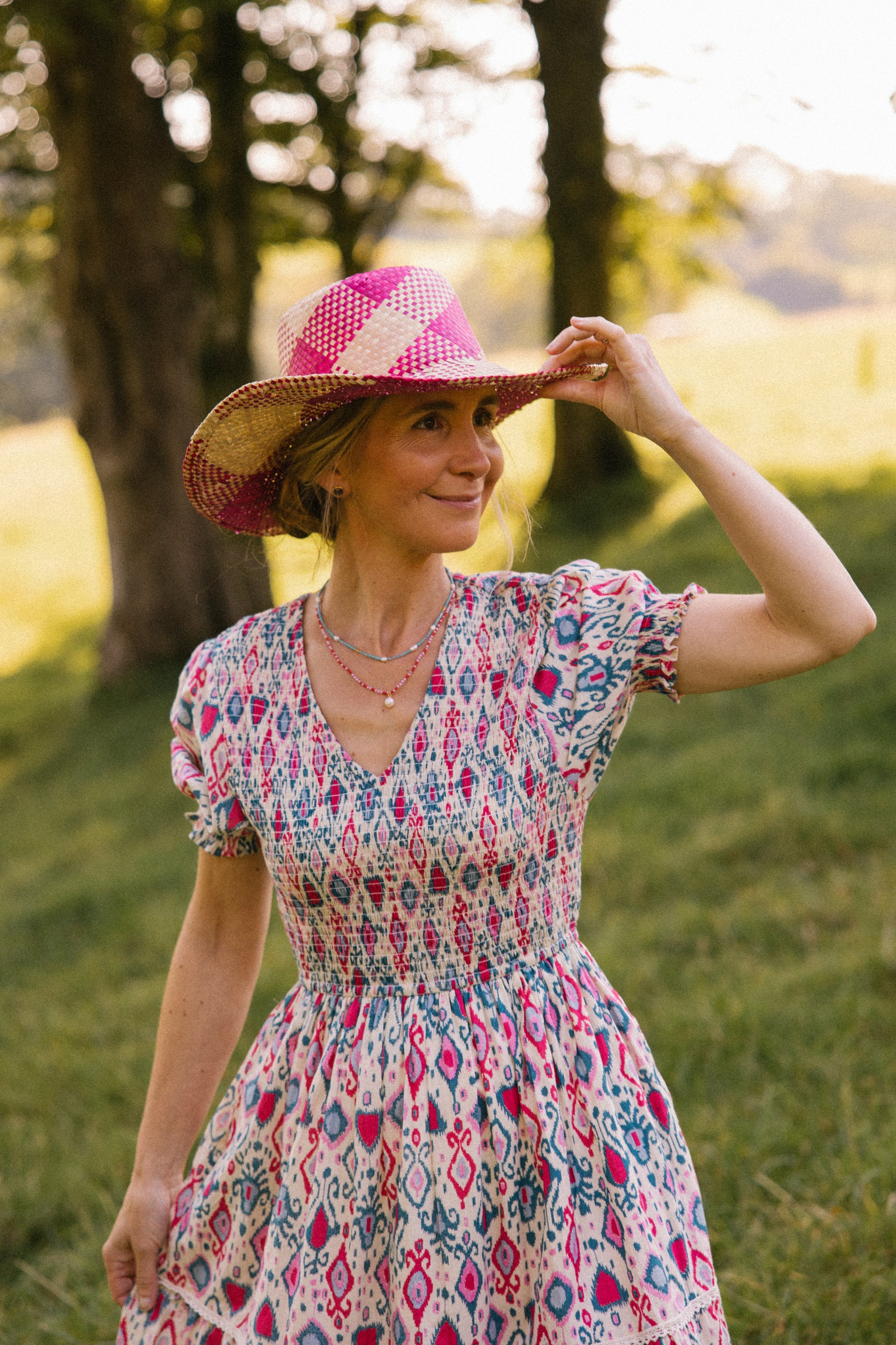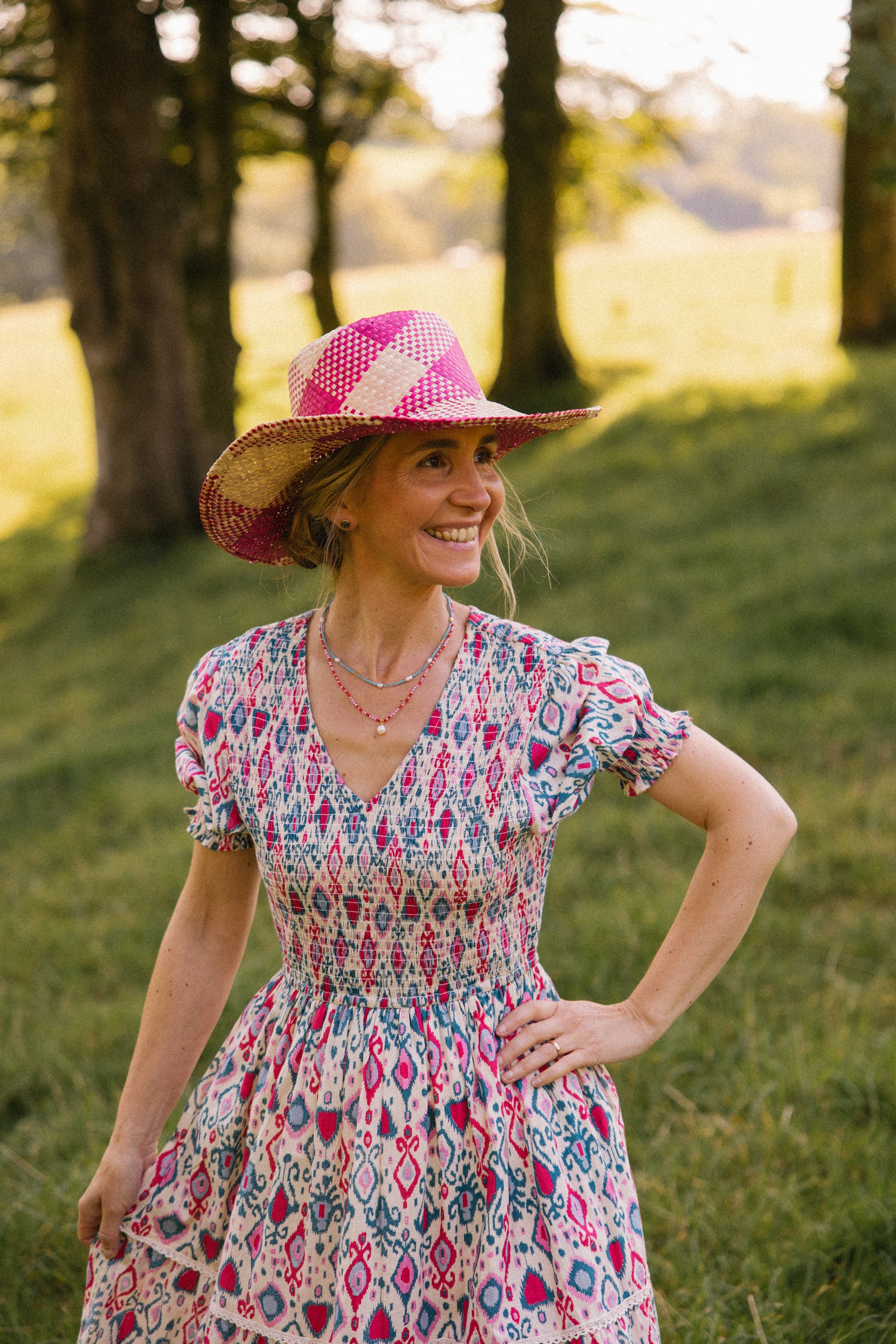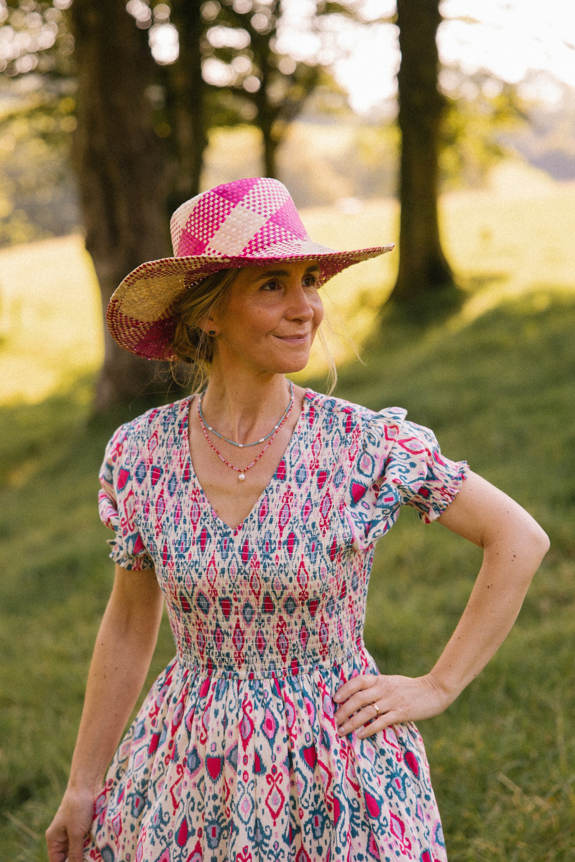 It's made from the union of navy and natural raffia colour's that's bold yet versatile. Made by our female artisans in Bali from natural sun baked palms, it has a sculpted crown and a brim that shields from the sun.