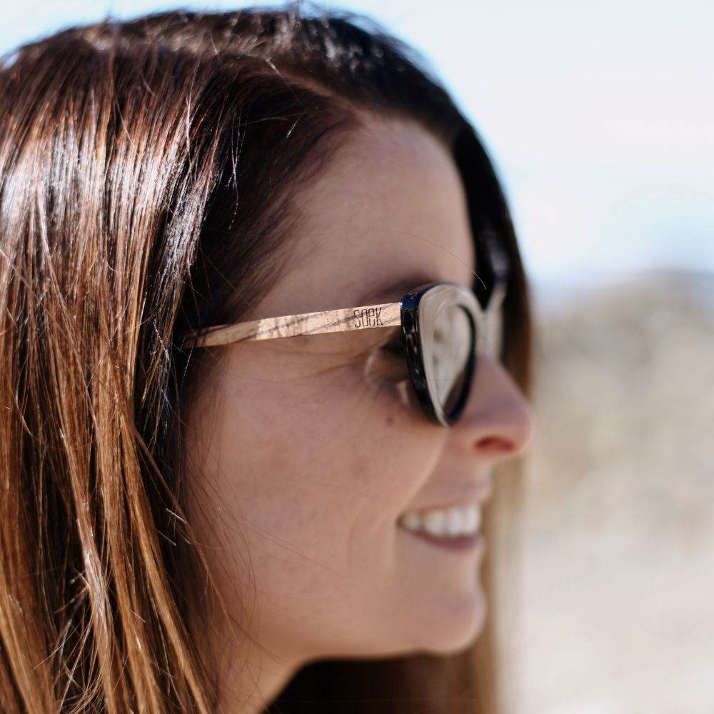 This is an iconic slim cat eye sunglass that never goes out of style. Favoured by style icons for generations, our Savannah is finished in classic black with walnut wood arms and fitted with Khaki lenses.