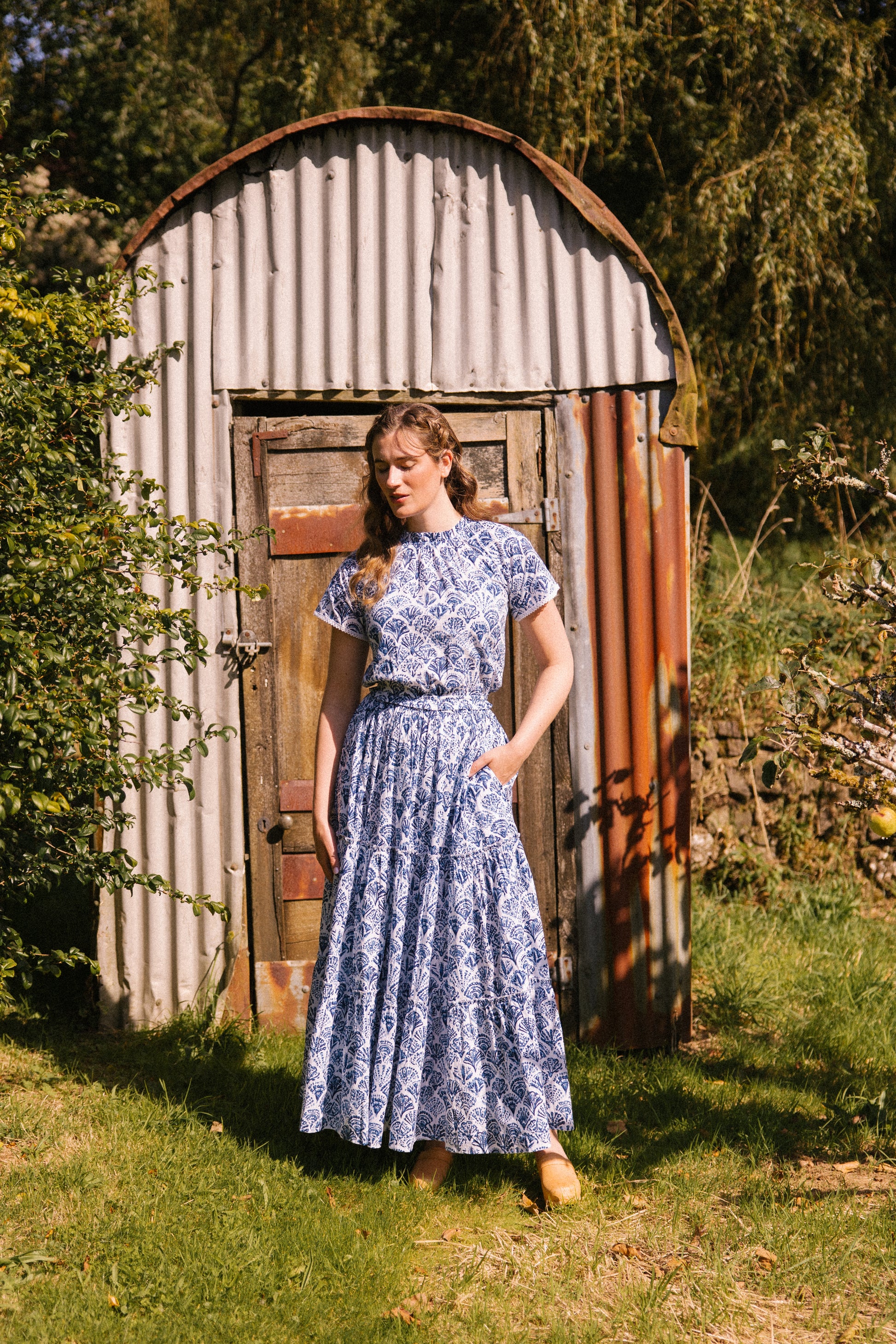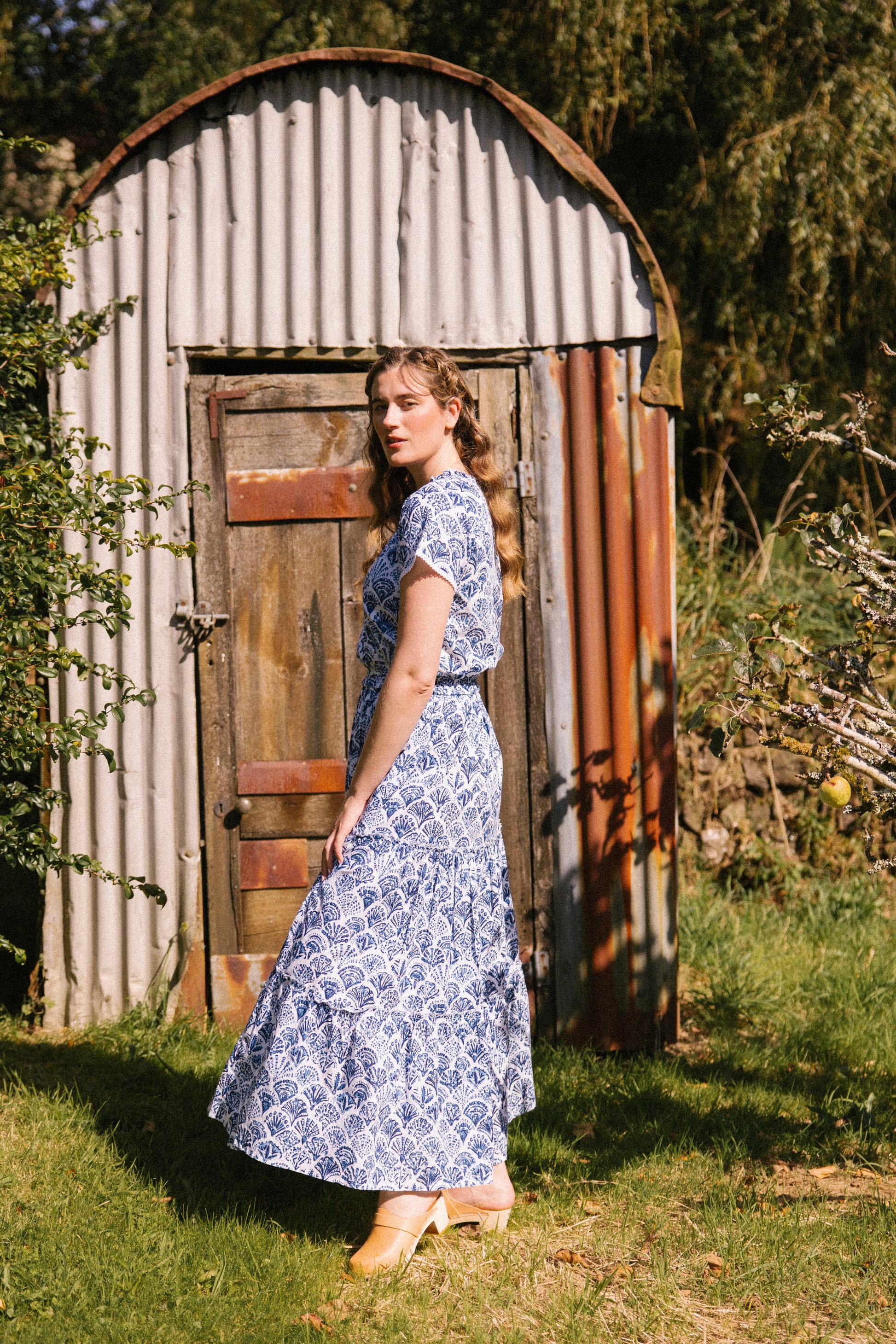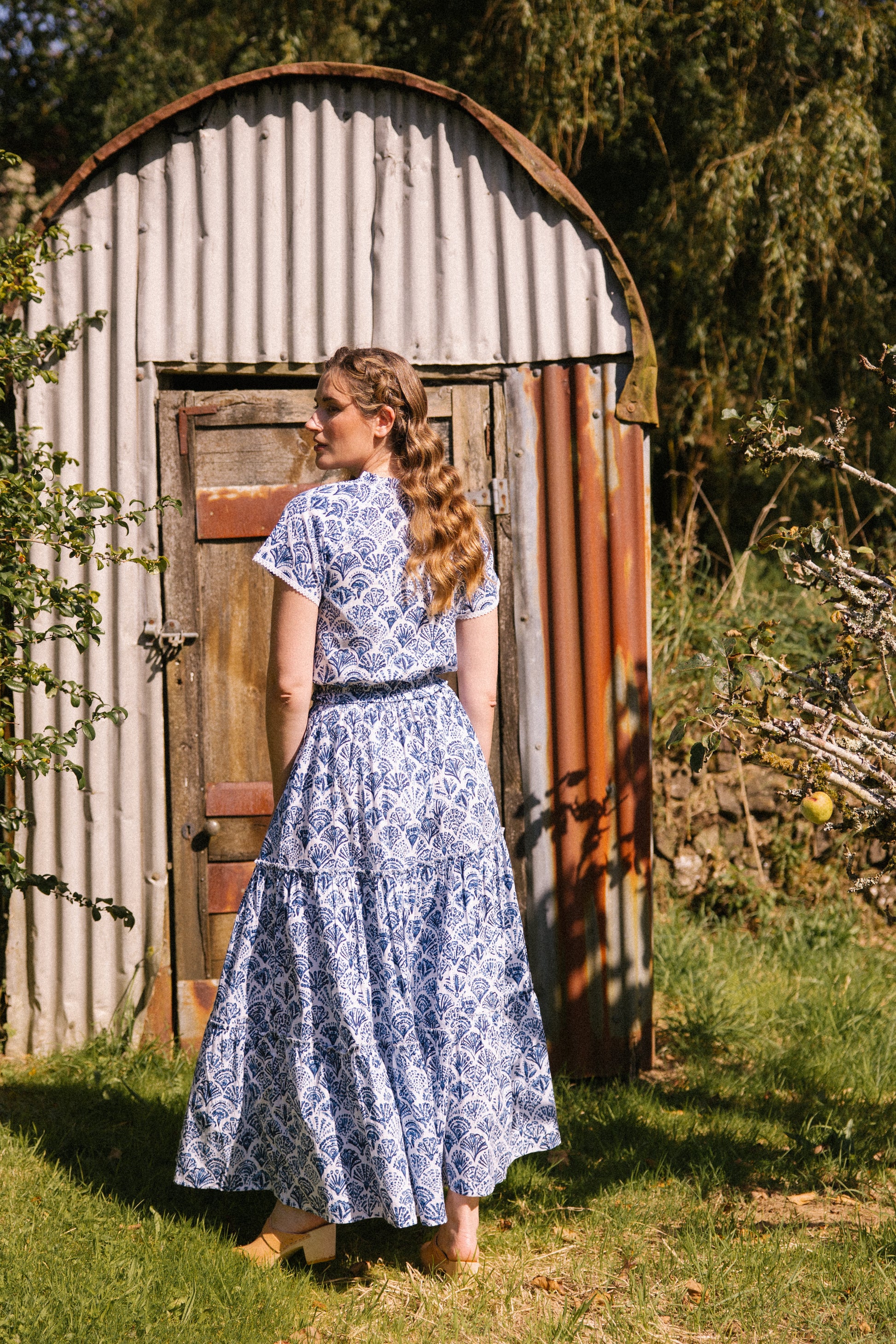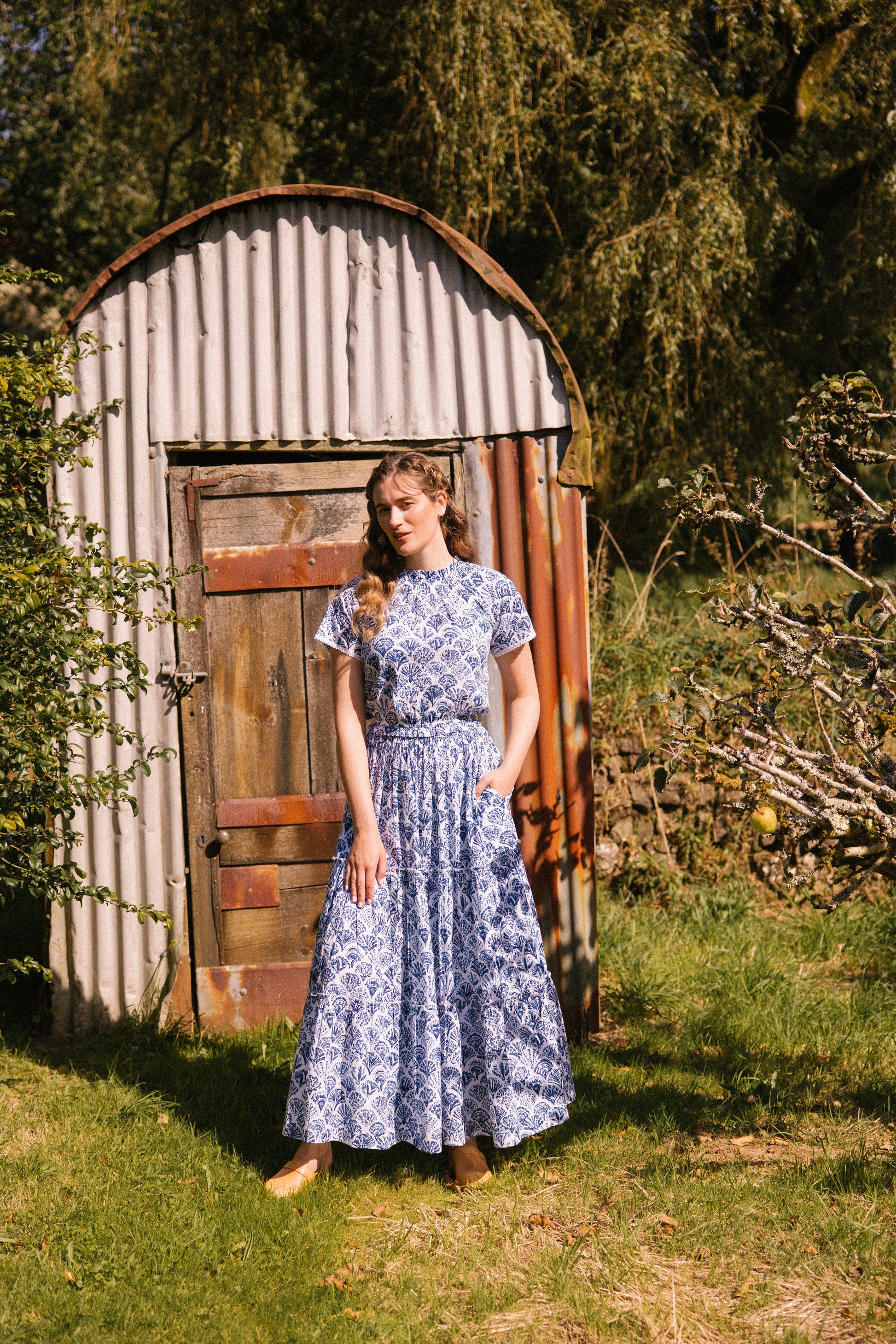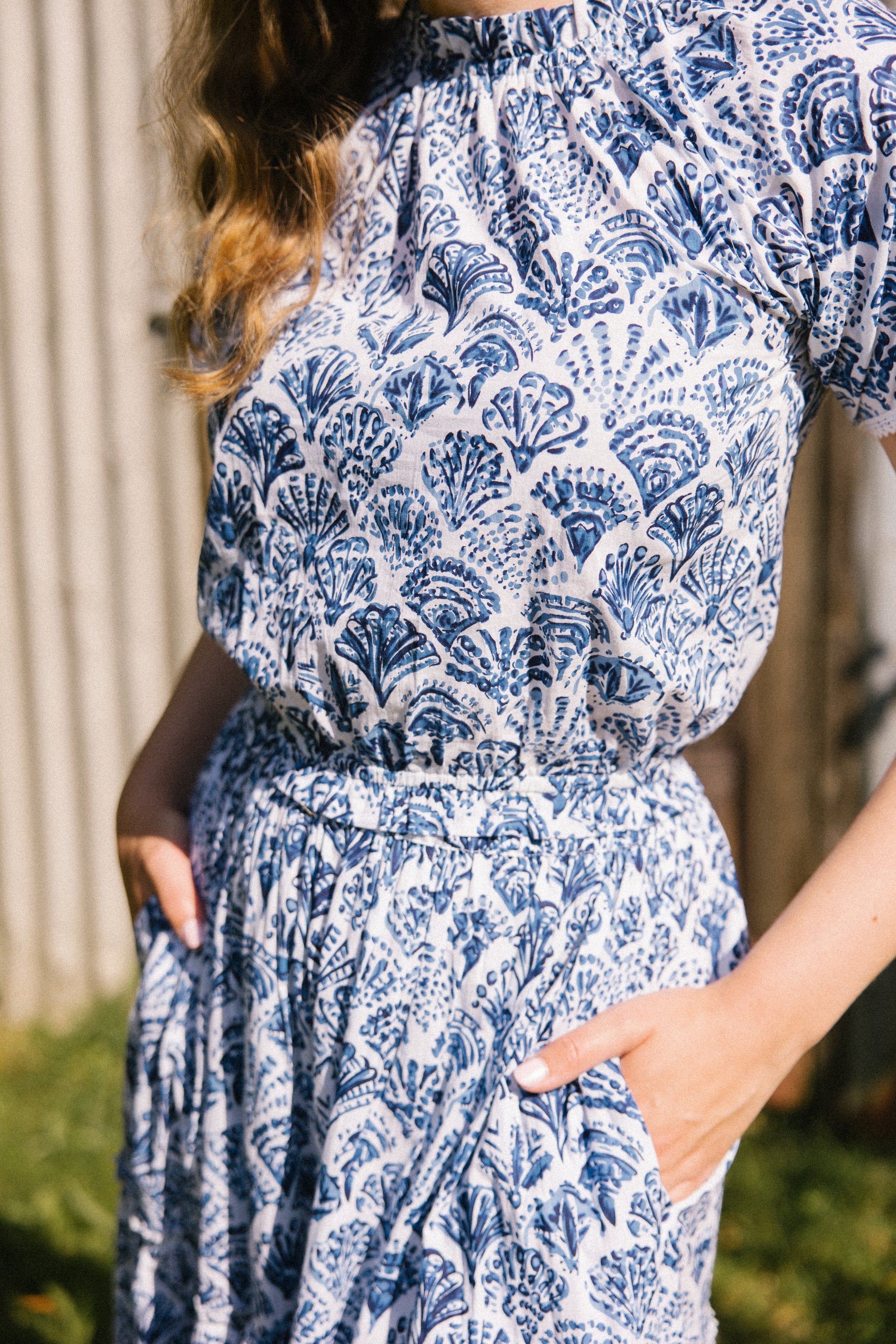 Sea shell is crafted in a crisp organic cotton and hand screen printed in our own exclusive shell print in rich blue tones.