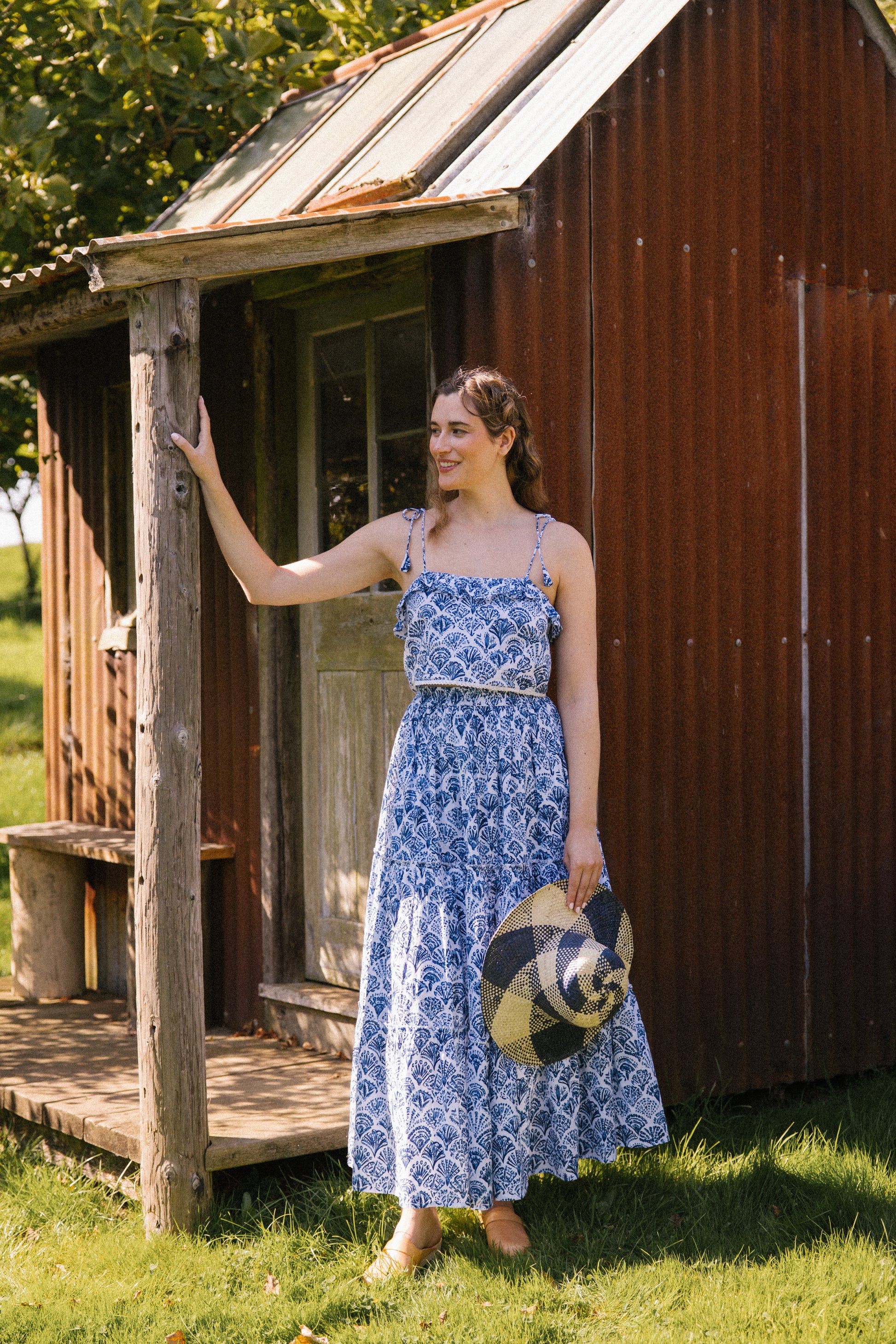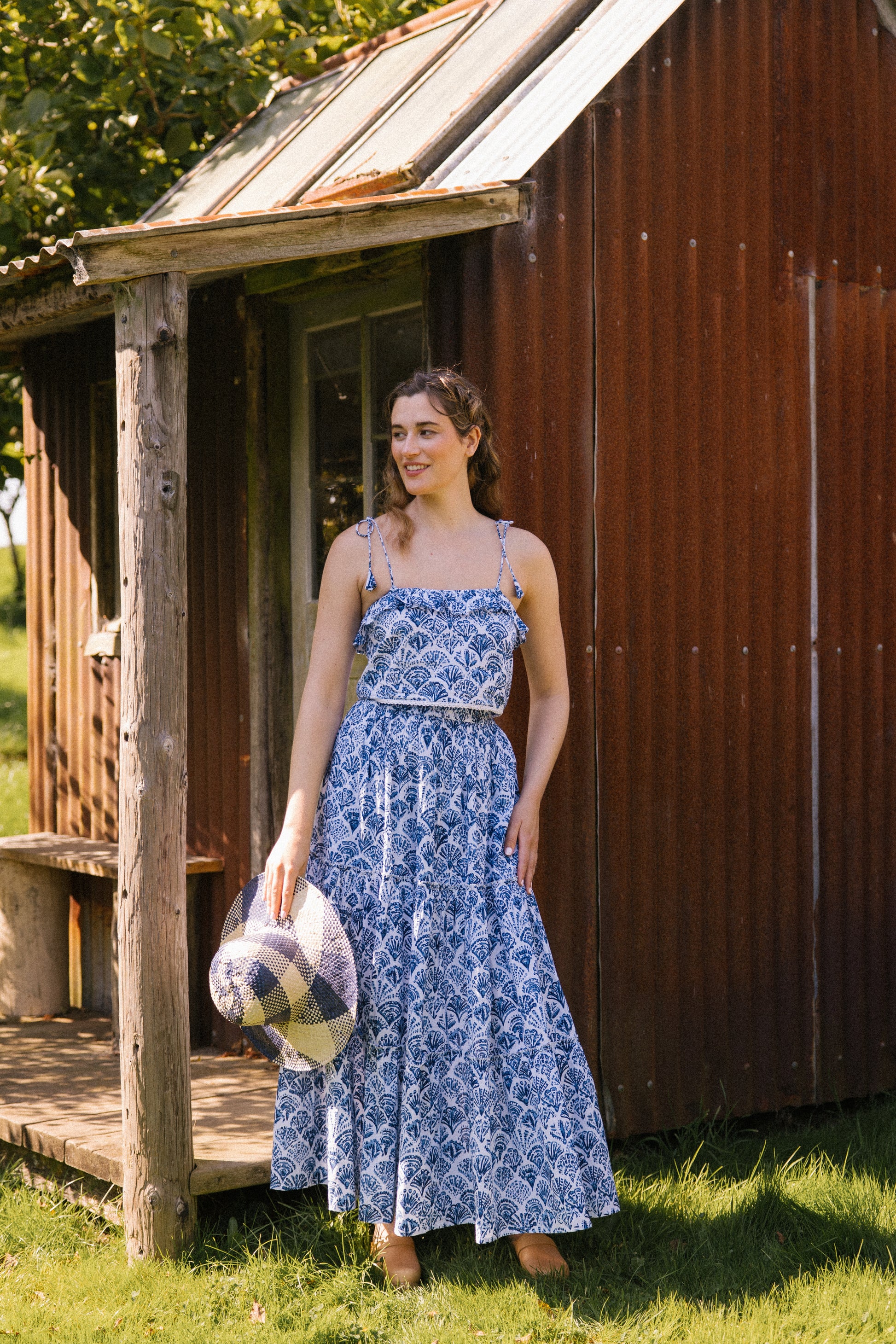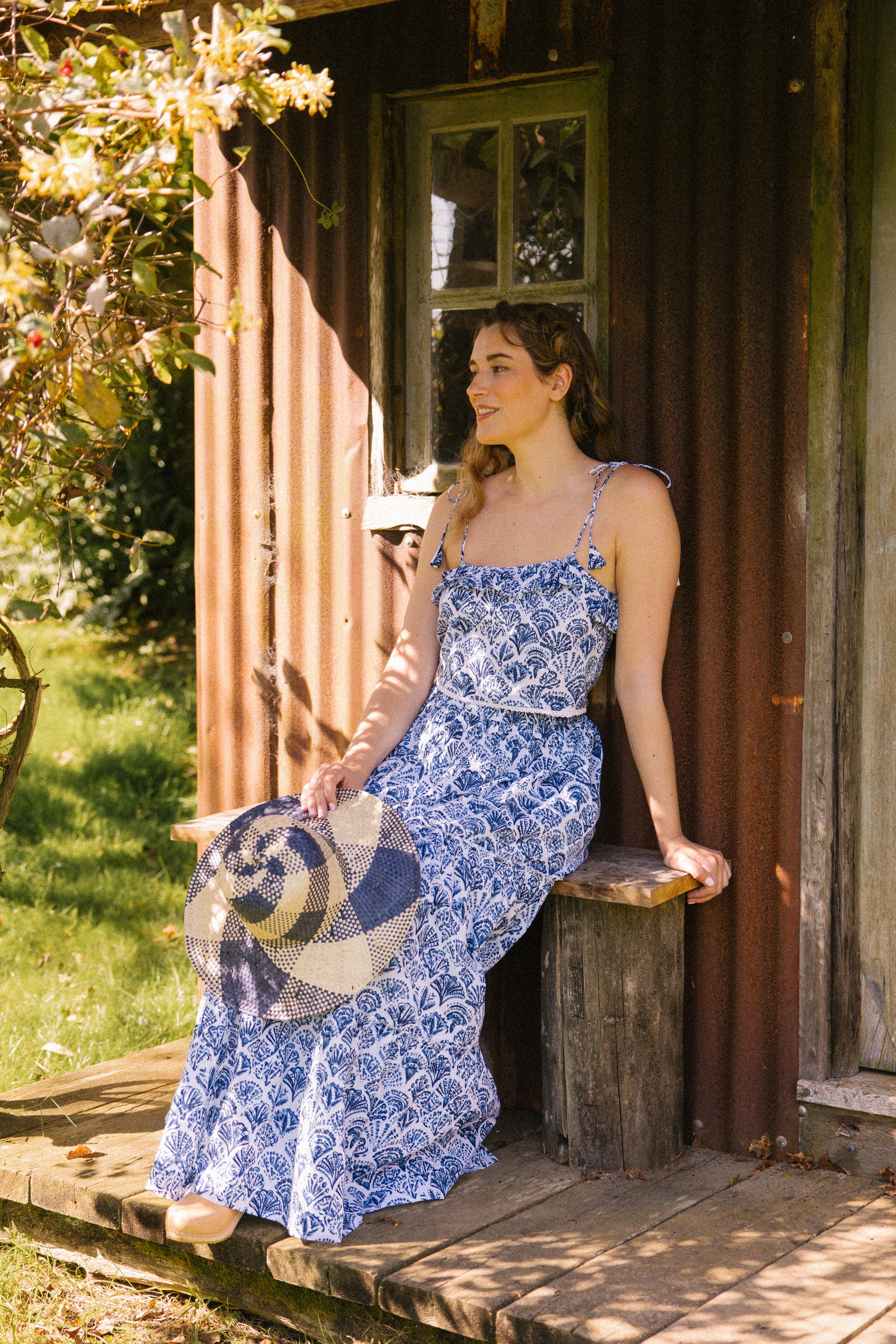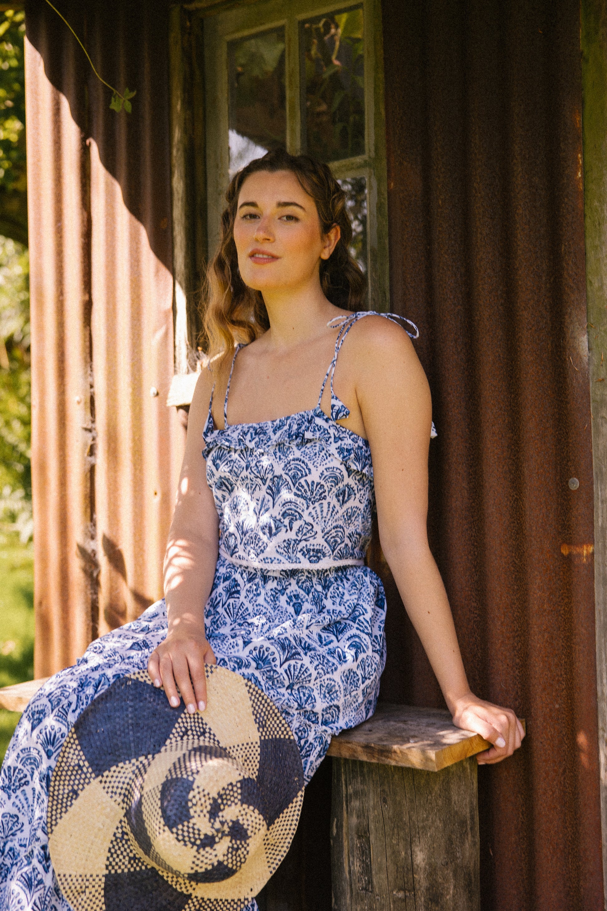 Sea shell is crafted in a crisp organic cotton and hand screen printed in our own exclusive shell print in rich blue tones.