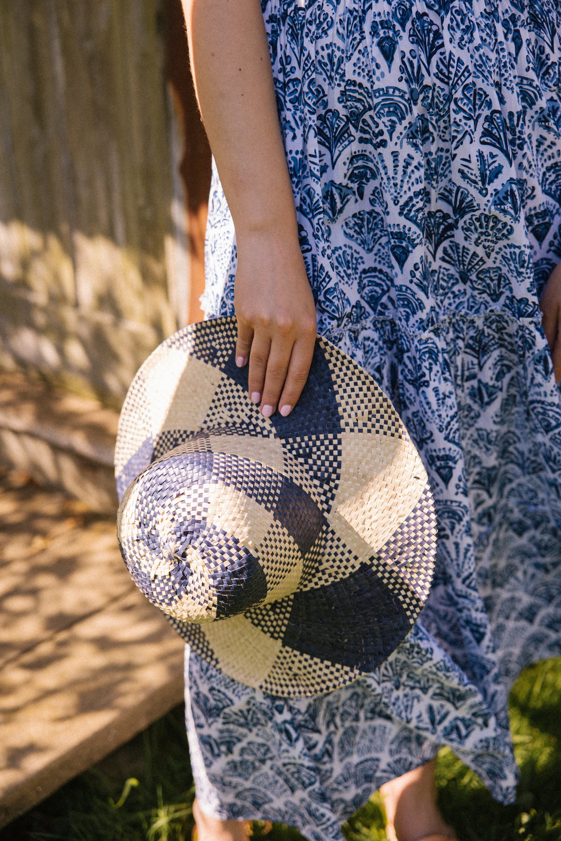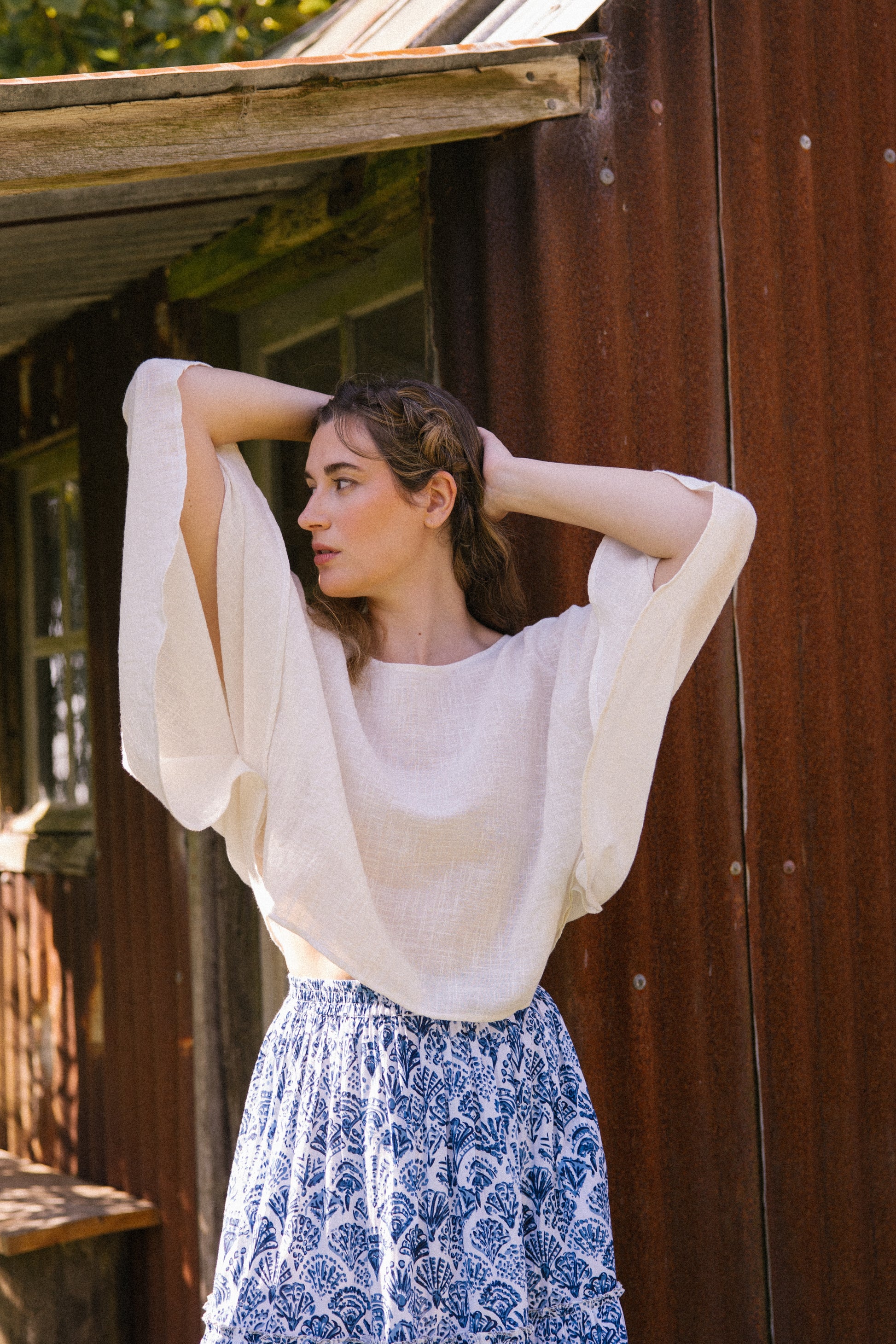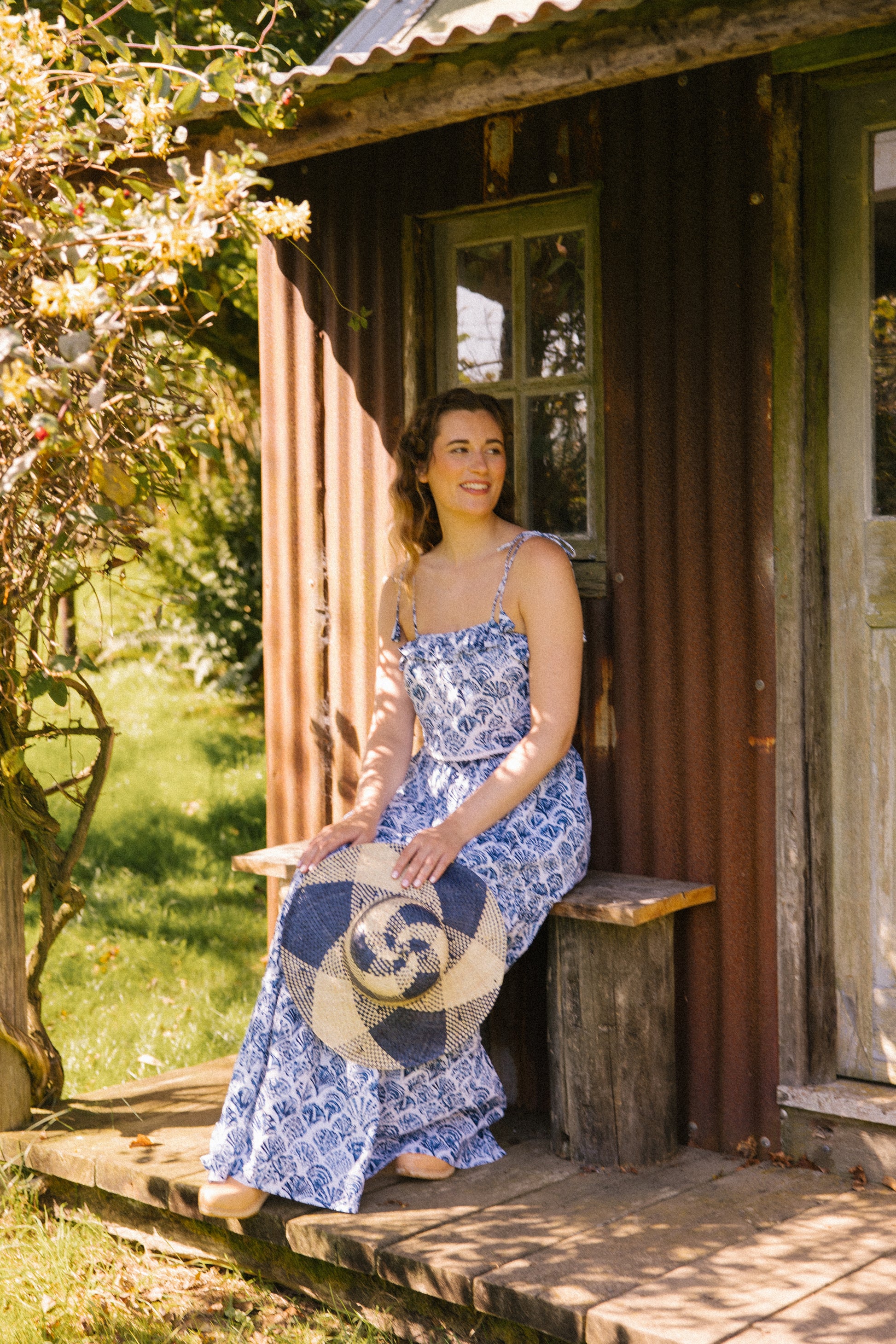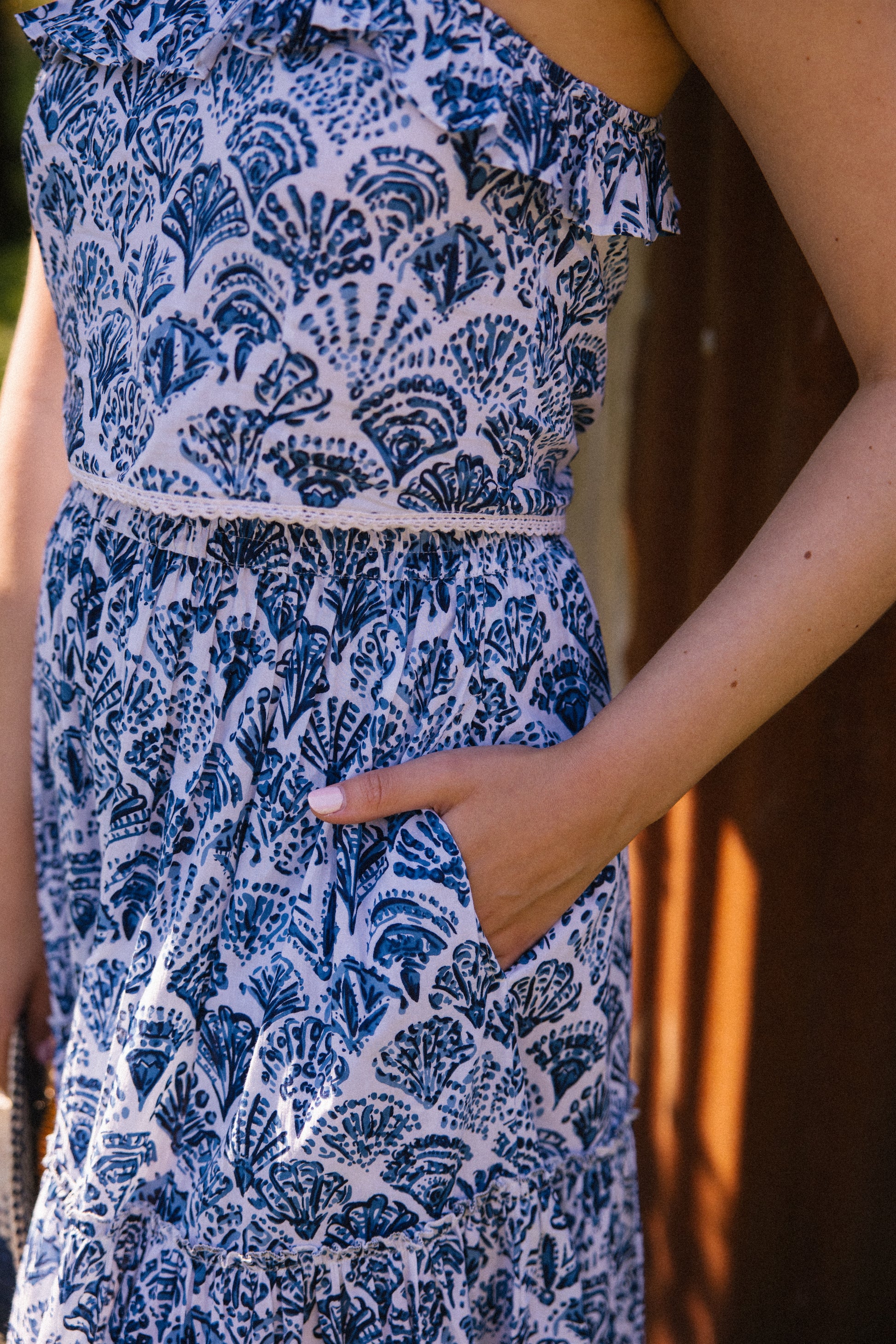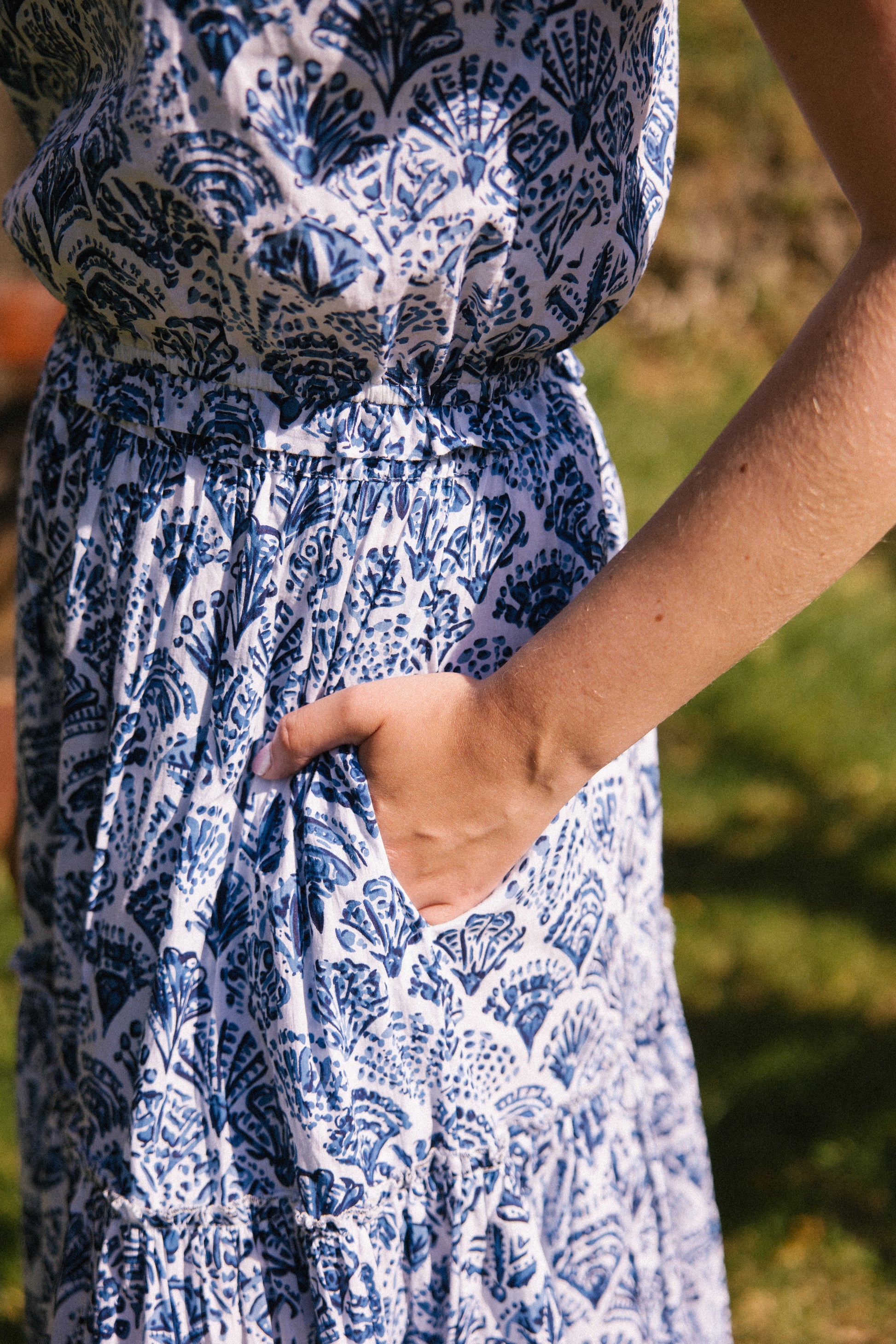 Sea shell is crafted in a crisp organic cotton and hand screen printed in our own exclusive shell print in rich blue tones.