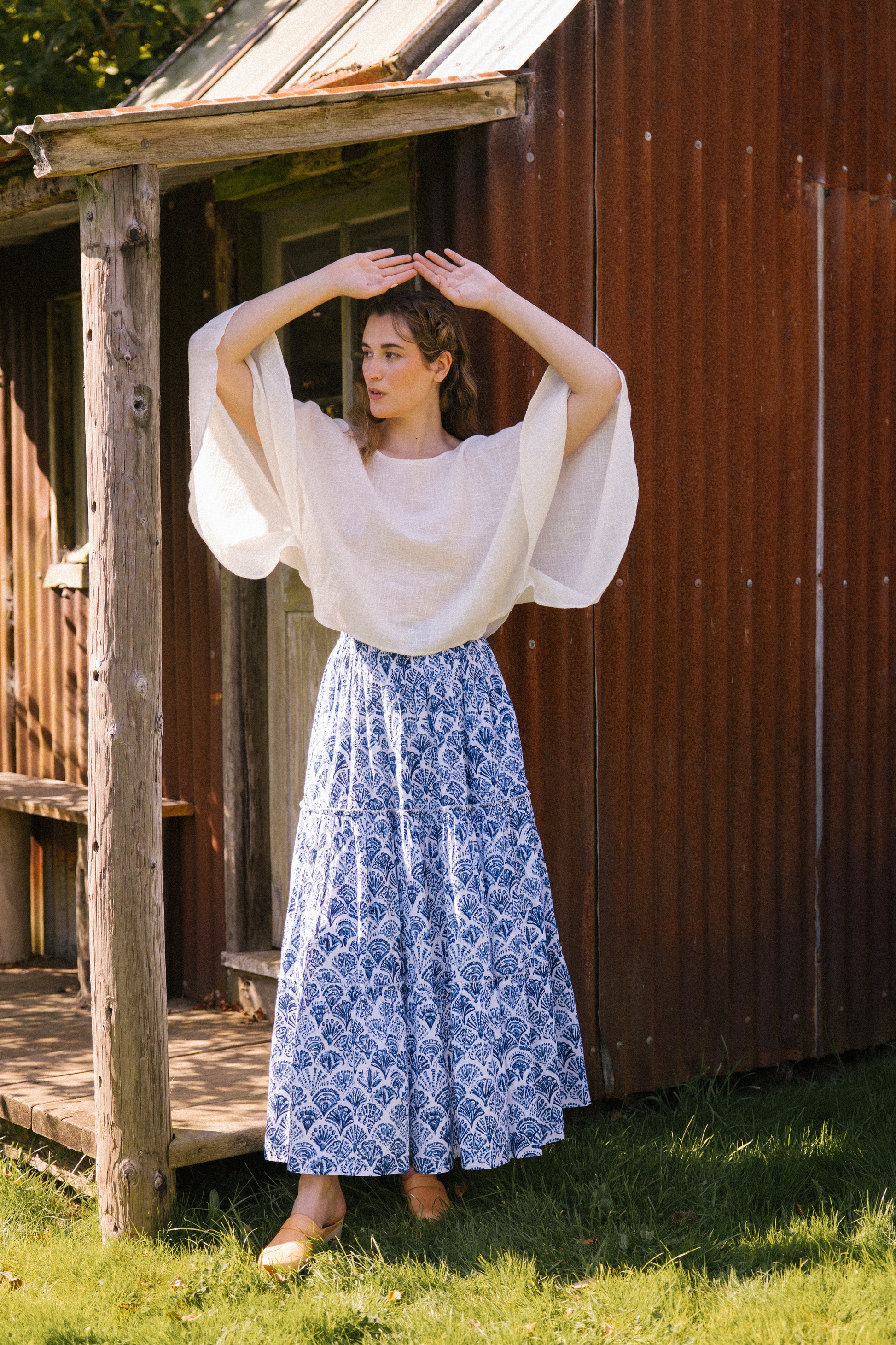 Feel cute in our Sea Shell skirt, with a beautiful feminine silhouette and a fun exclusive shell design. Sea shell is a tiered detail maxi skirt with a gentle elasticated waist.
