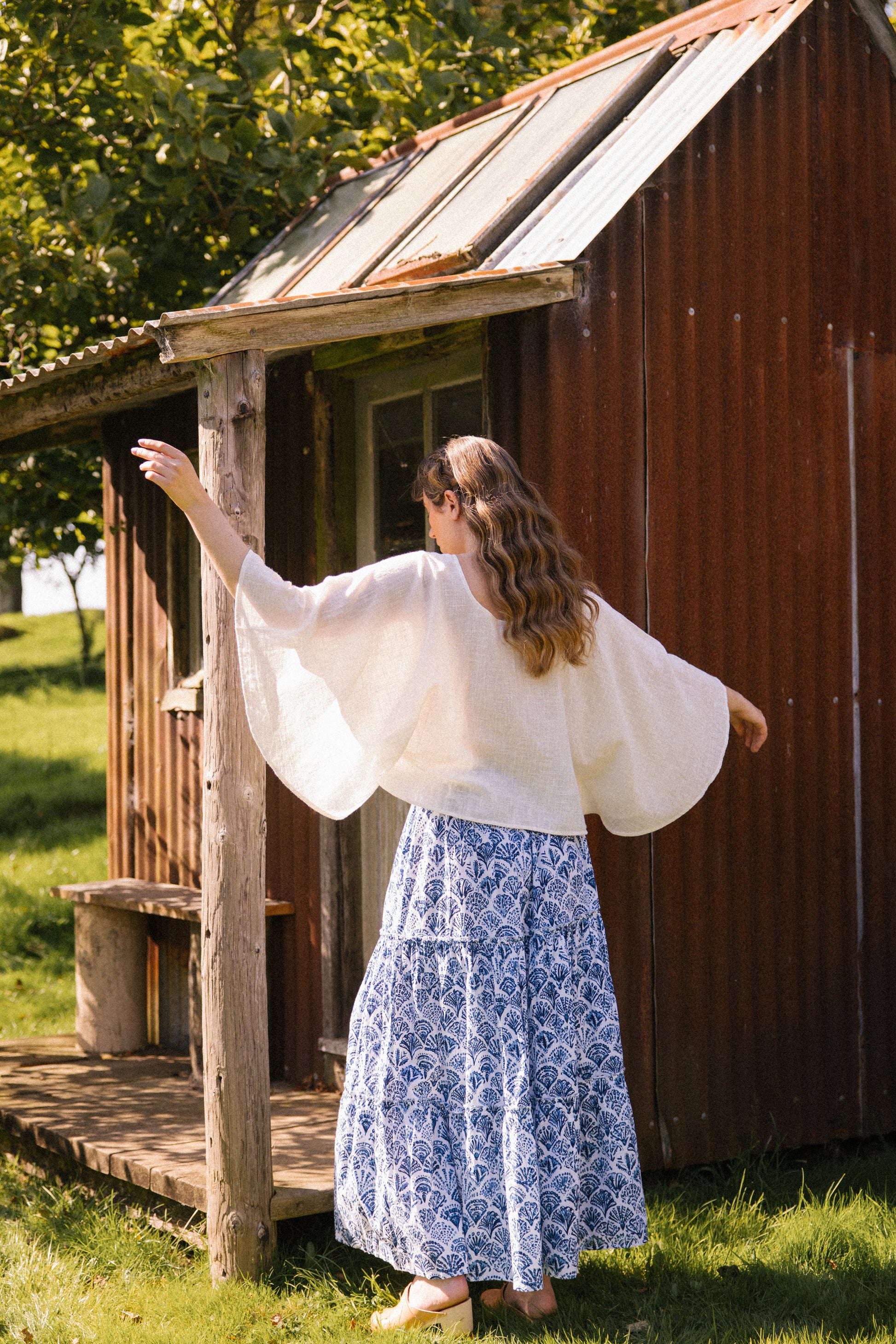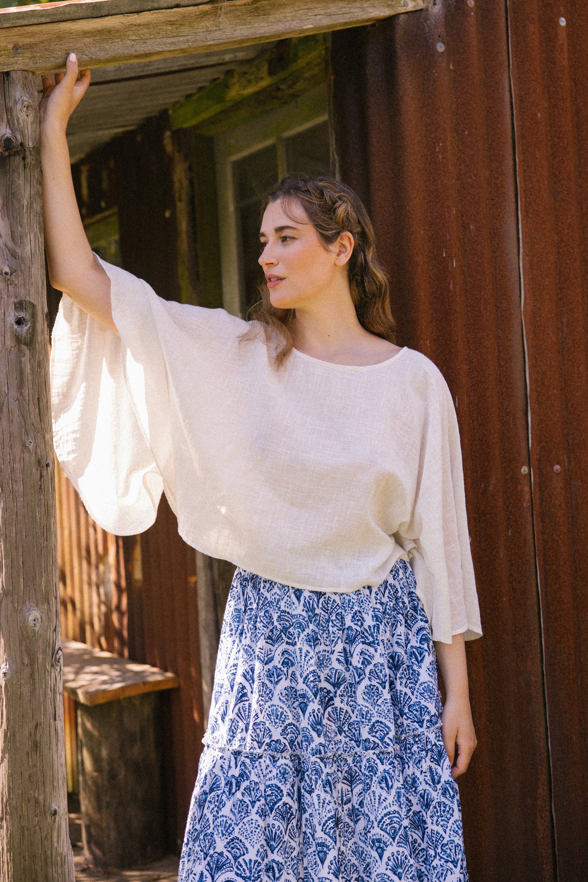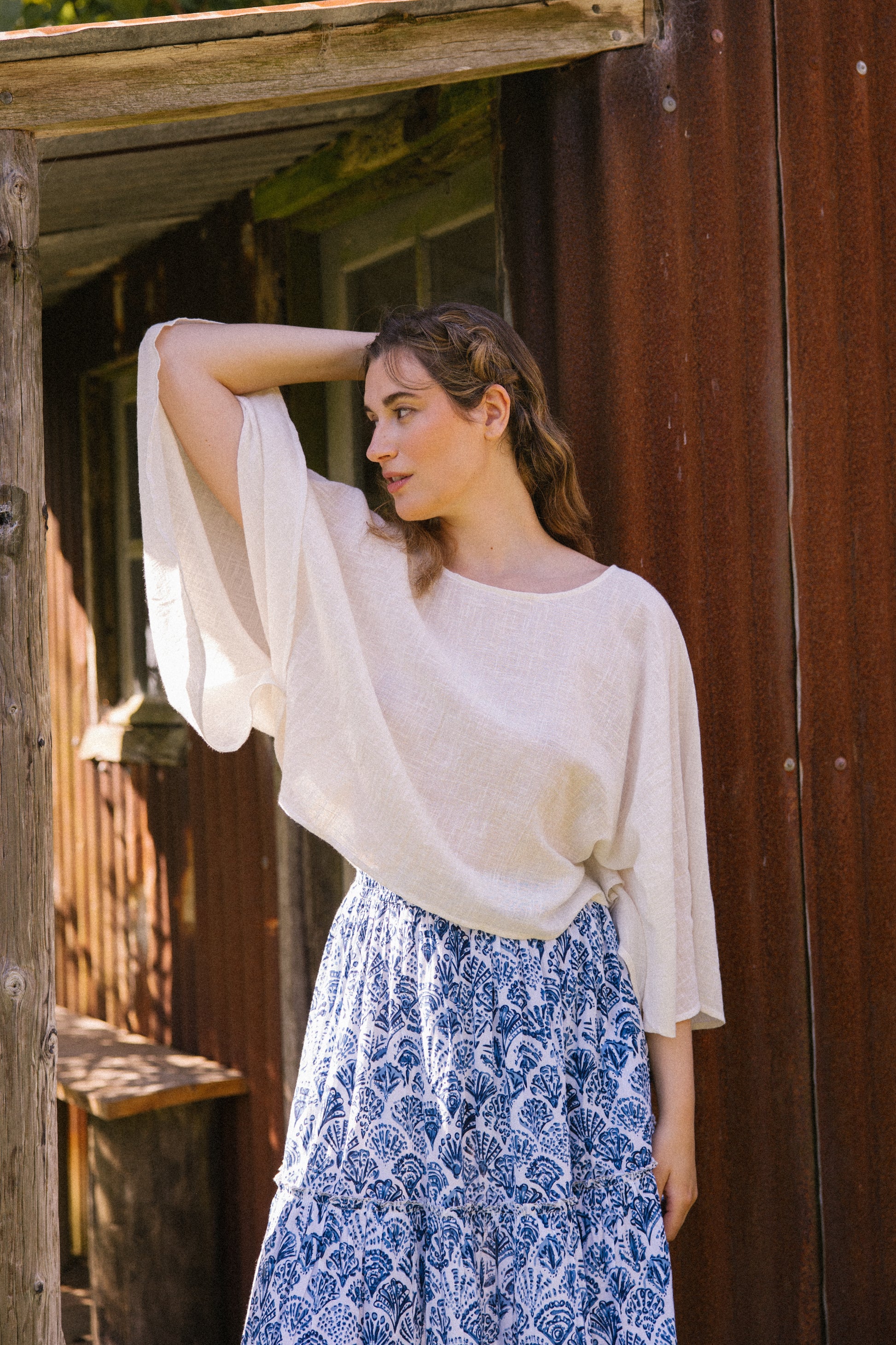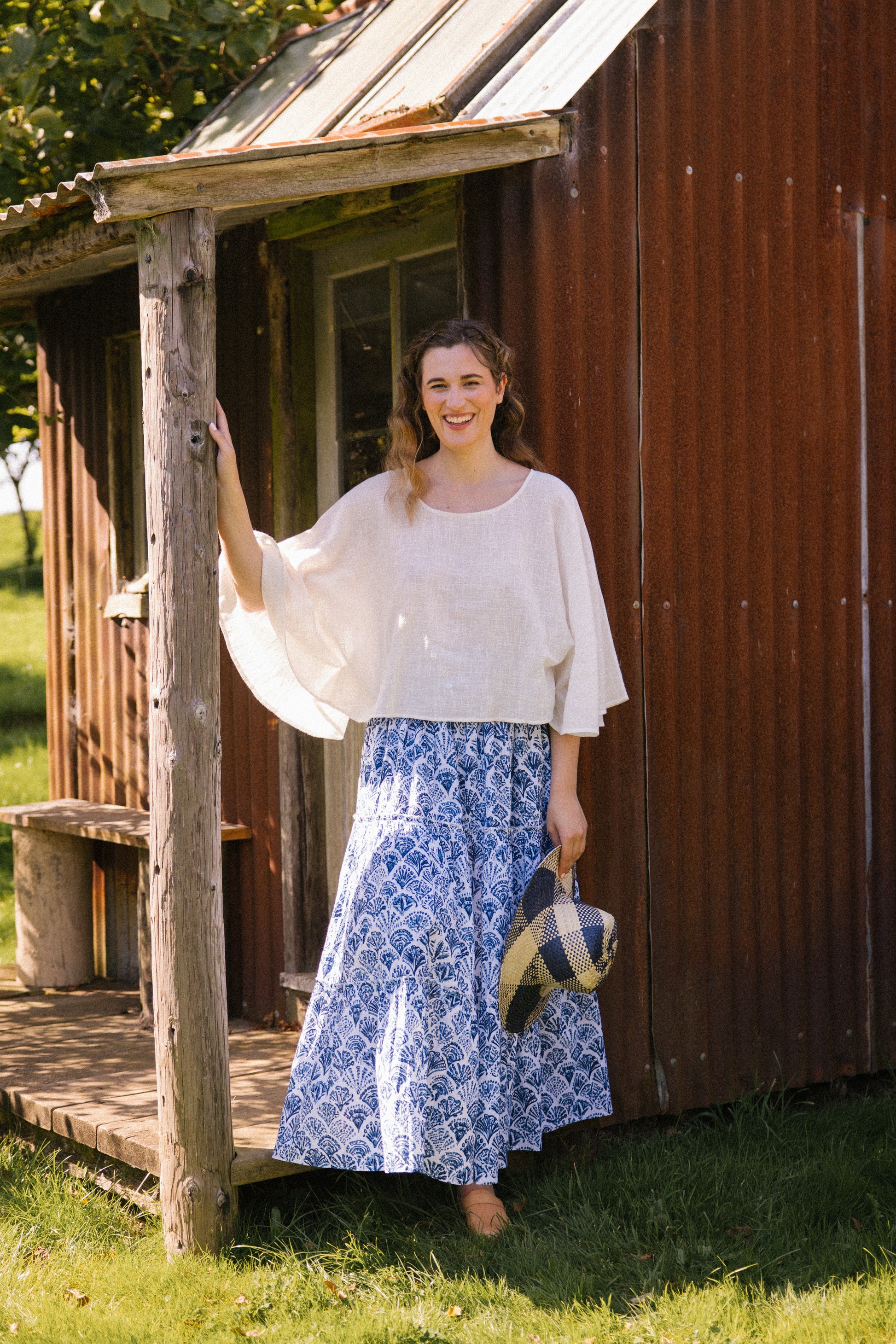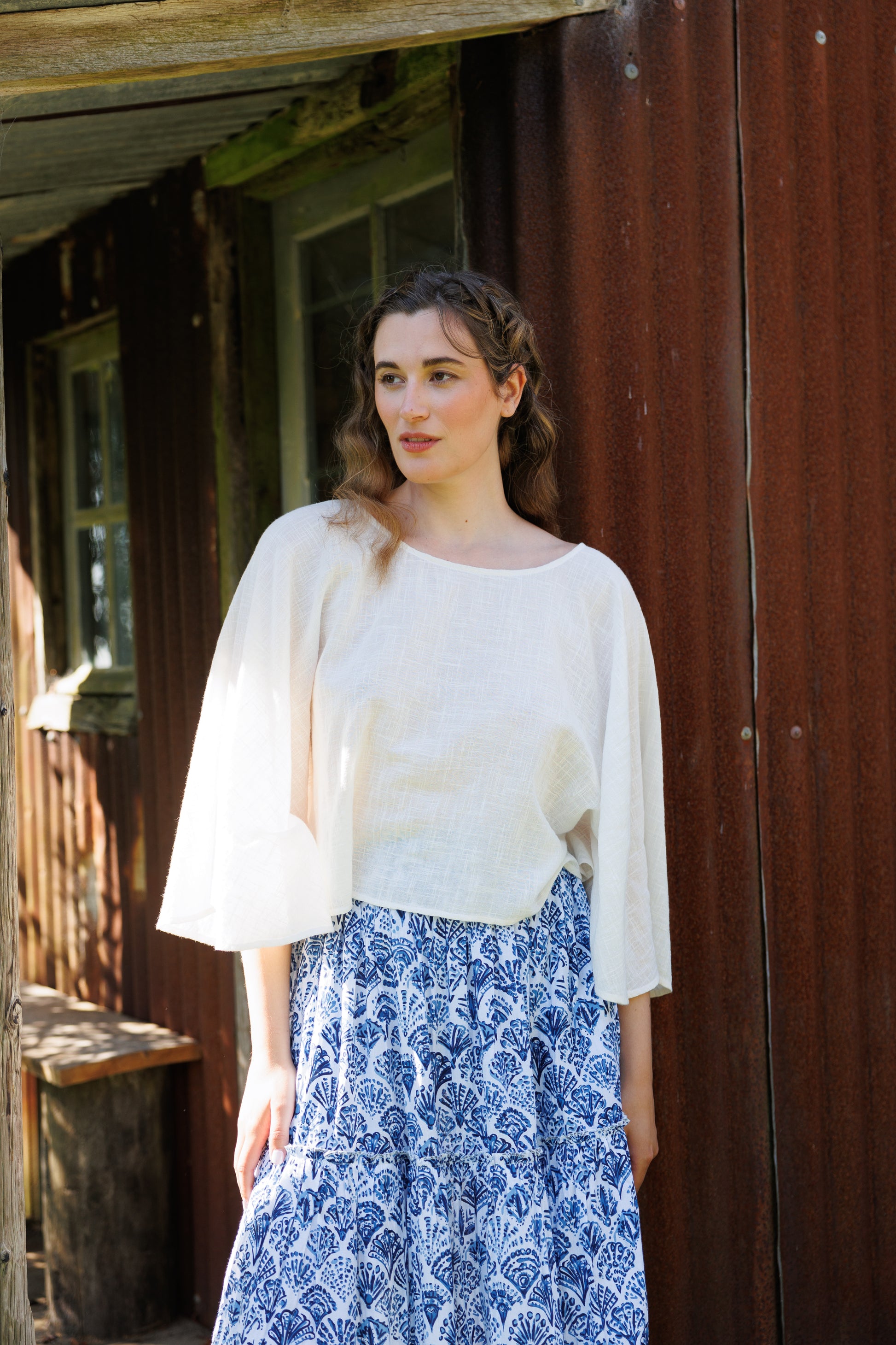 Sea shell is crafted in a crisp organic cotton and hand screen printed in our own exclusive shell print in rich blue tones.