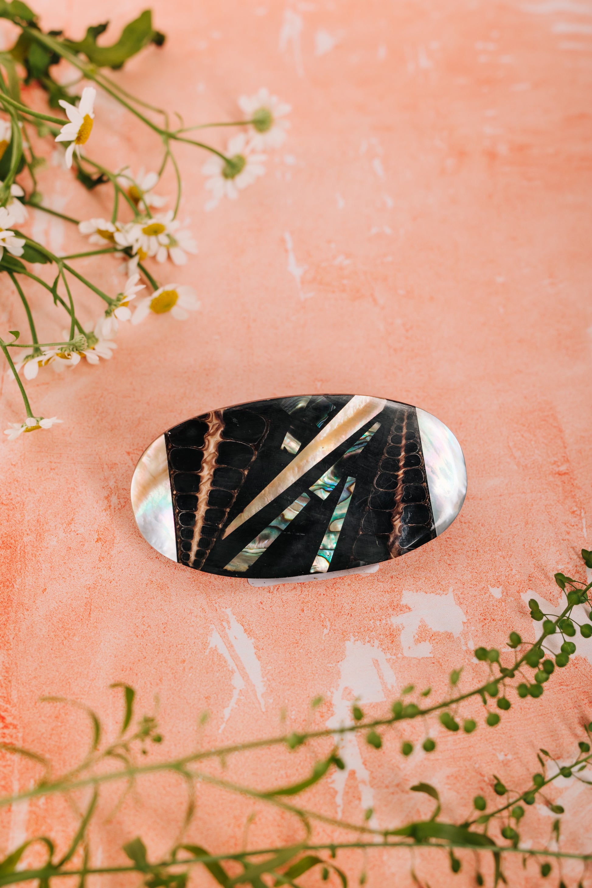 The strips of shell are all handmade and inlaid to make this hair clip .