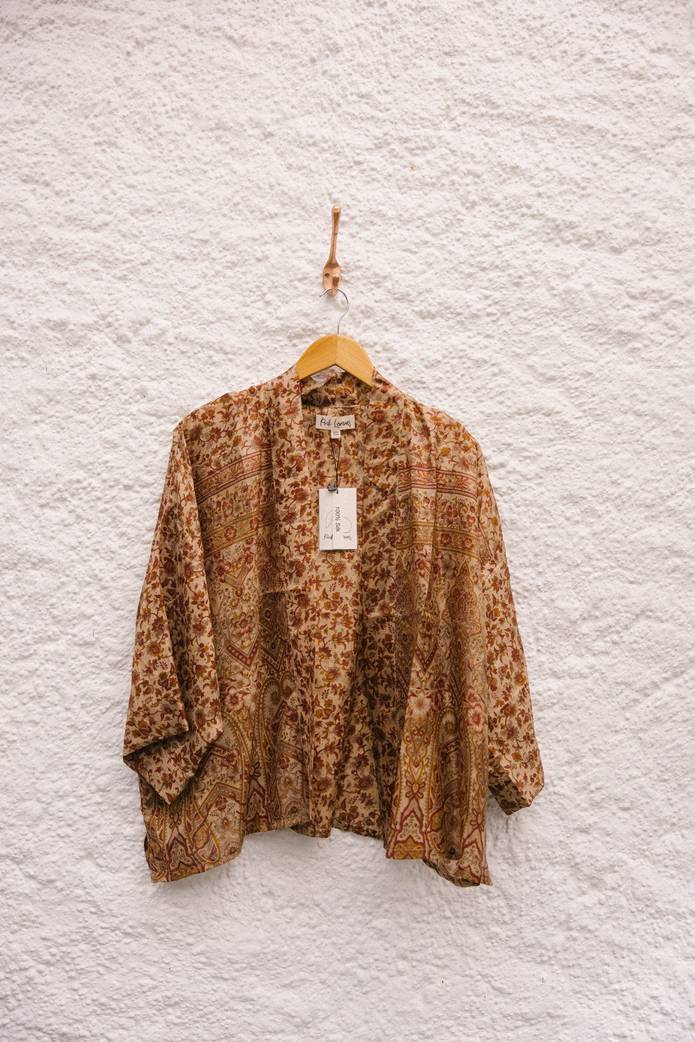 A silk kimono is an easy layering piece to have in your wardrobe, she can be dressed up with big beads and a nice camisole for an evening out or just thrown on as a cover up by the pool. It's cut in a laid back shape that will be comfortable to lounge in and has wide sleeves and dropped shoulders. I personally like to tie mine up and wear with jeans.
