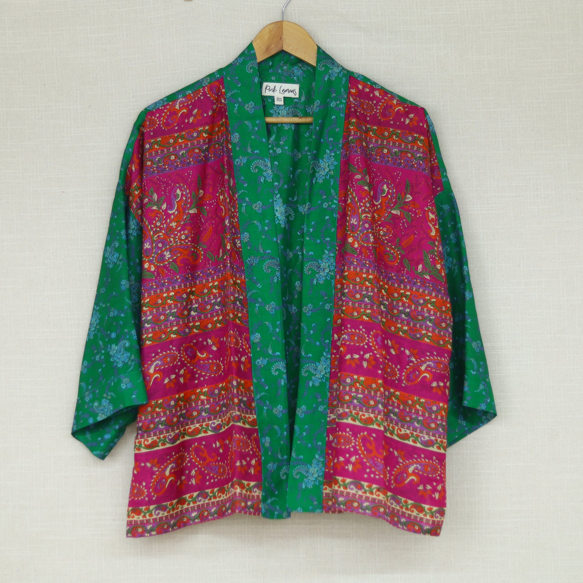 A silk kimono is an easy layering piece to have in your wardrobe, she can be dressed up with big beads and a nice camisole for an evening out or just thrown on as a cover up by the pool. It's cut in a laid back shape that will be comfortable to lounge in and has wide sleeves and dropped shoulders. I personally like to tie mine up and wear with jeans.