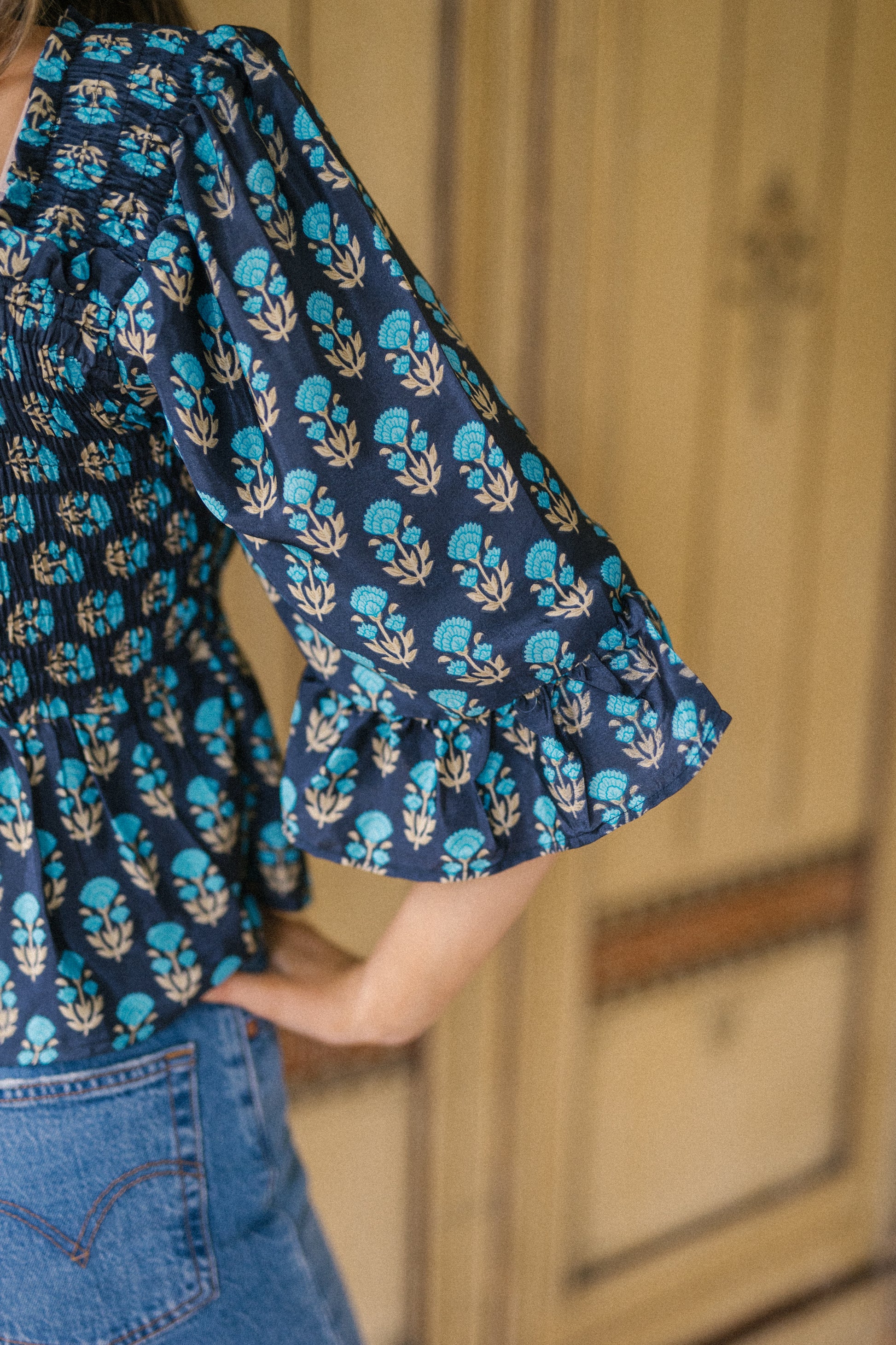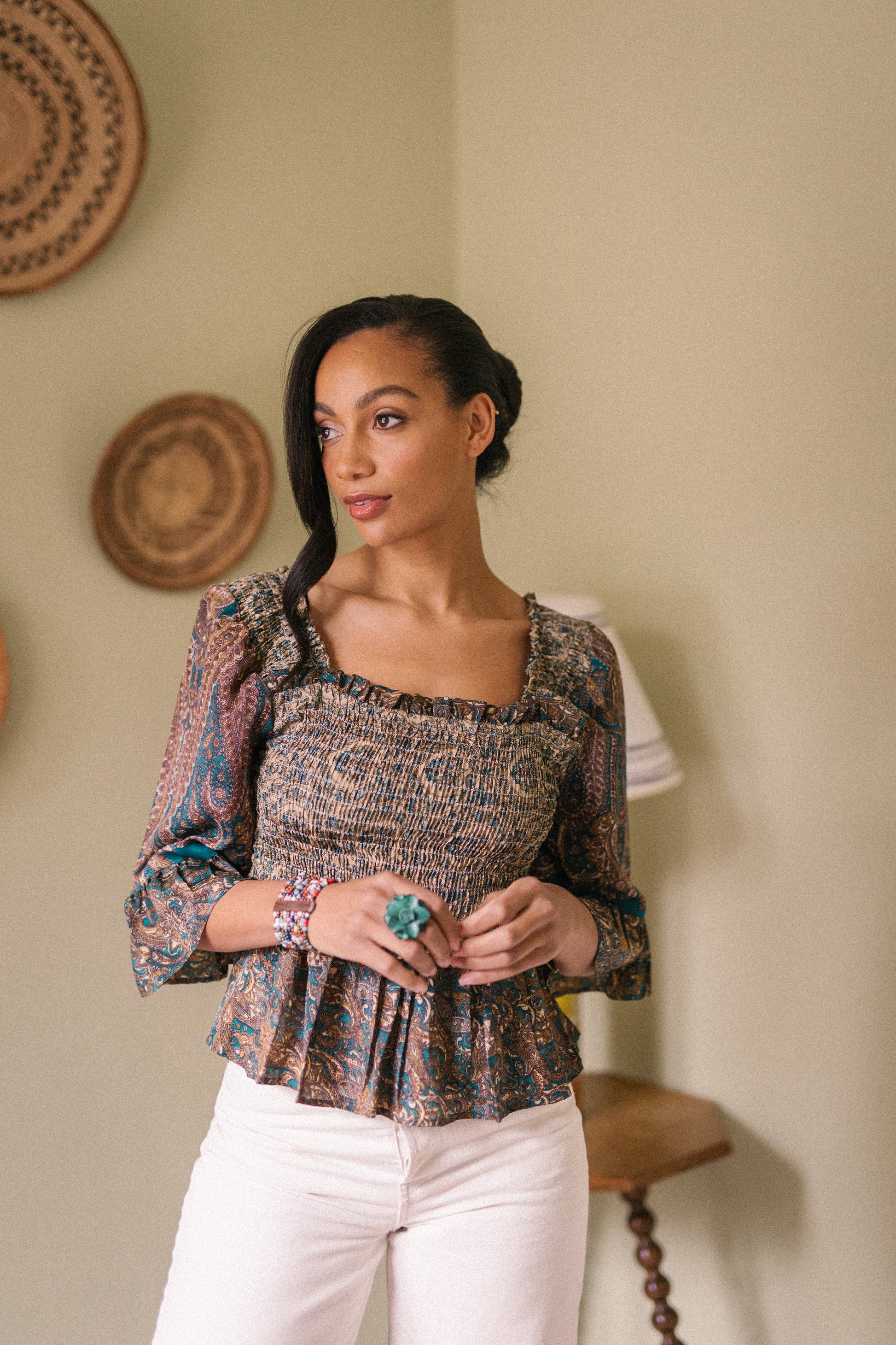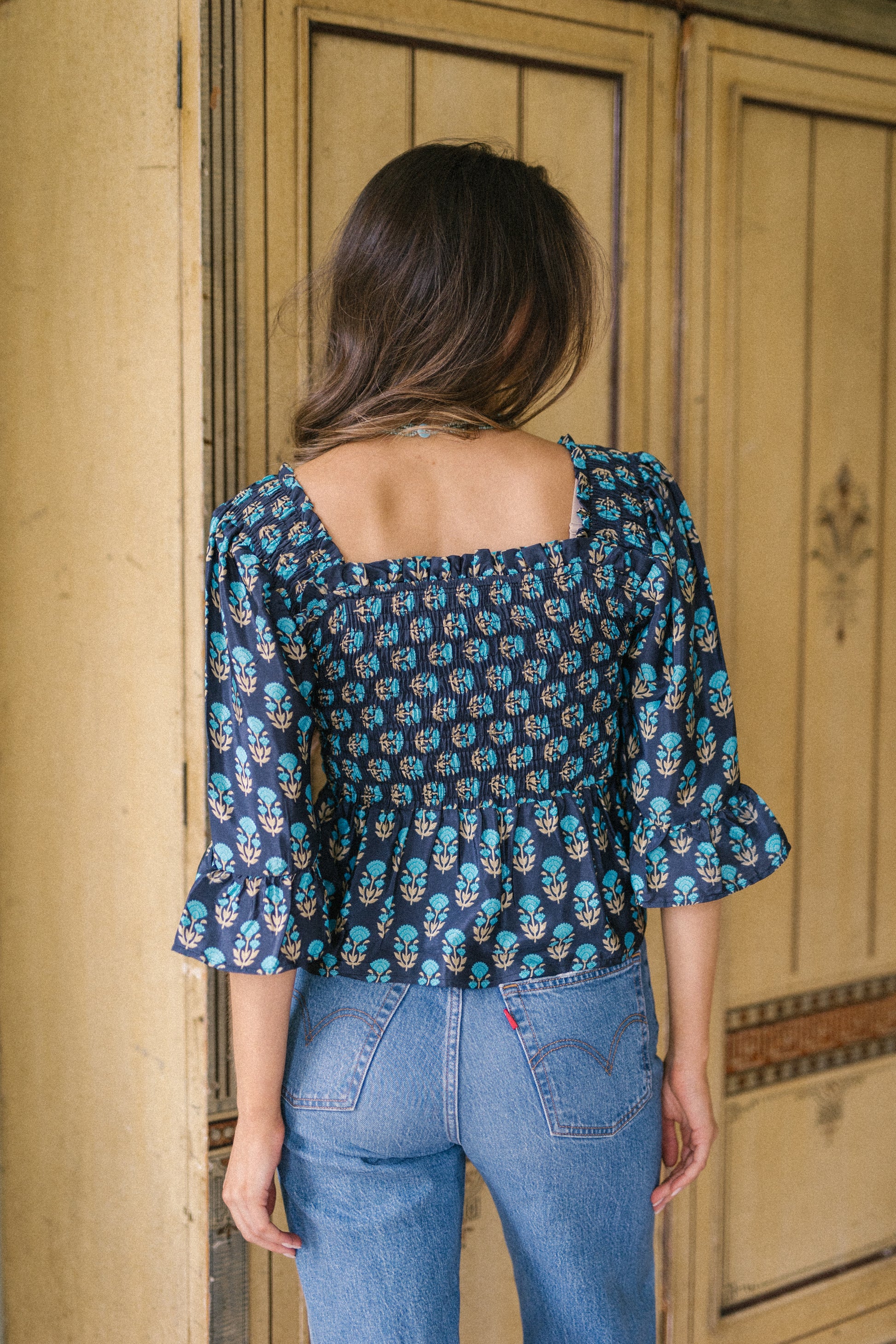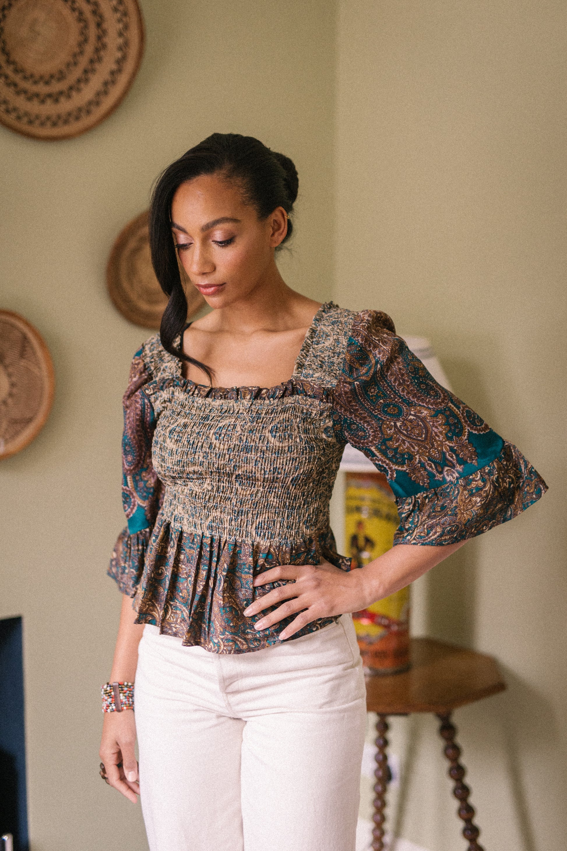 Joelyn is an elegant shirring smock silhouette with year around appeal. She has a smocked bodice, 3/4 length sleeves with a floaty ruffle cuff, a flattering Square neckline front and back with a peplum hem. Joelyn is hand crafted from Vintage up-cycled silk sari's.