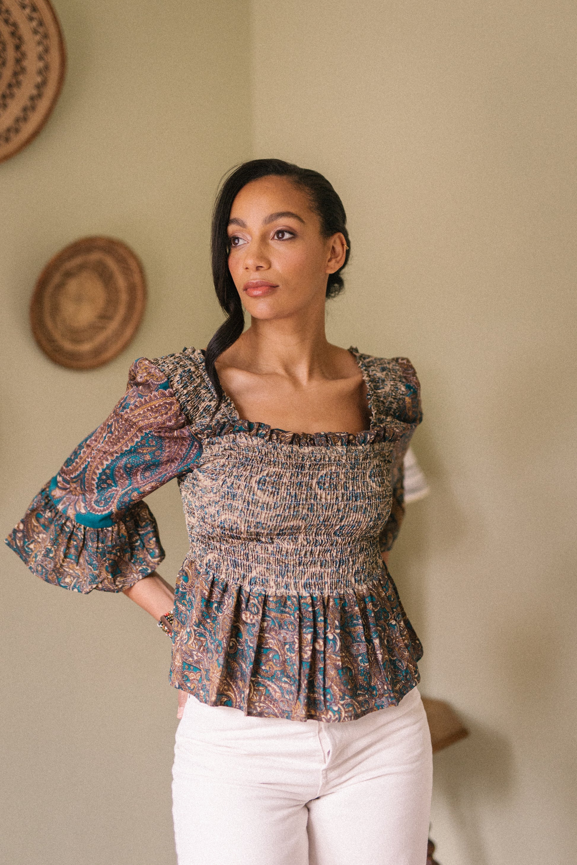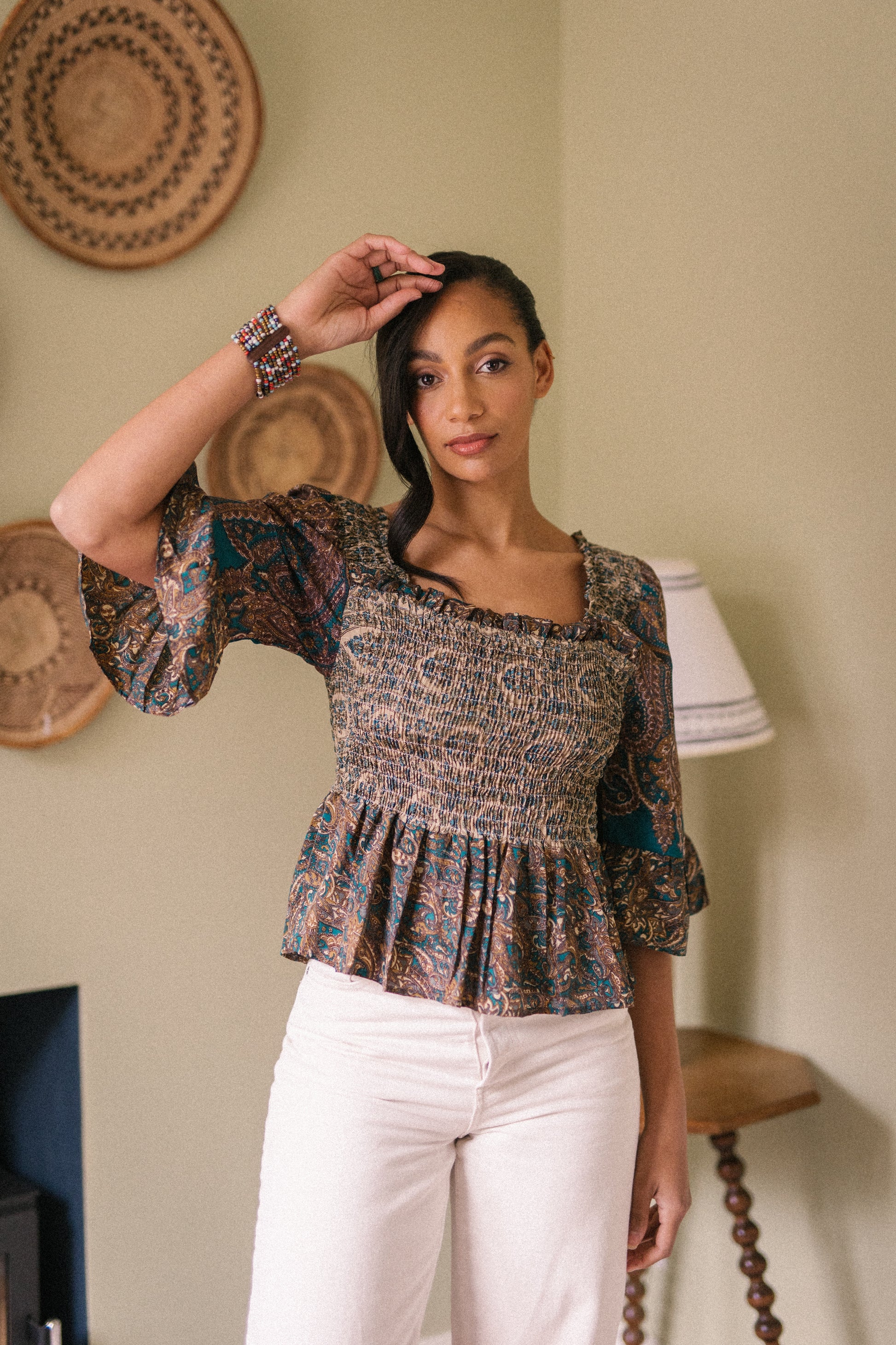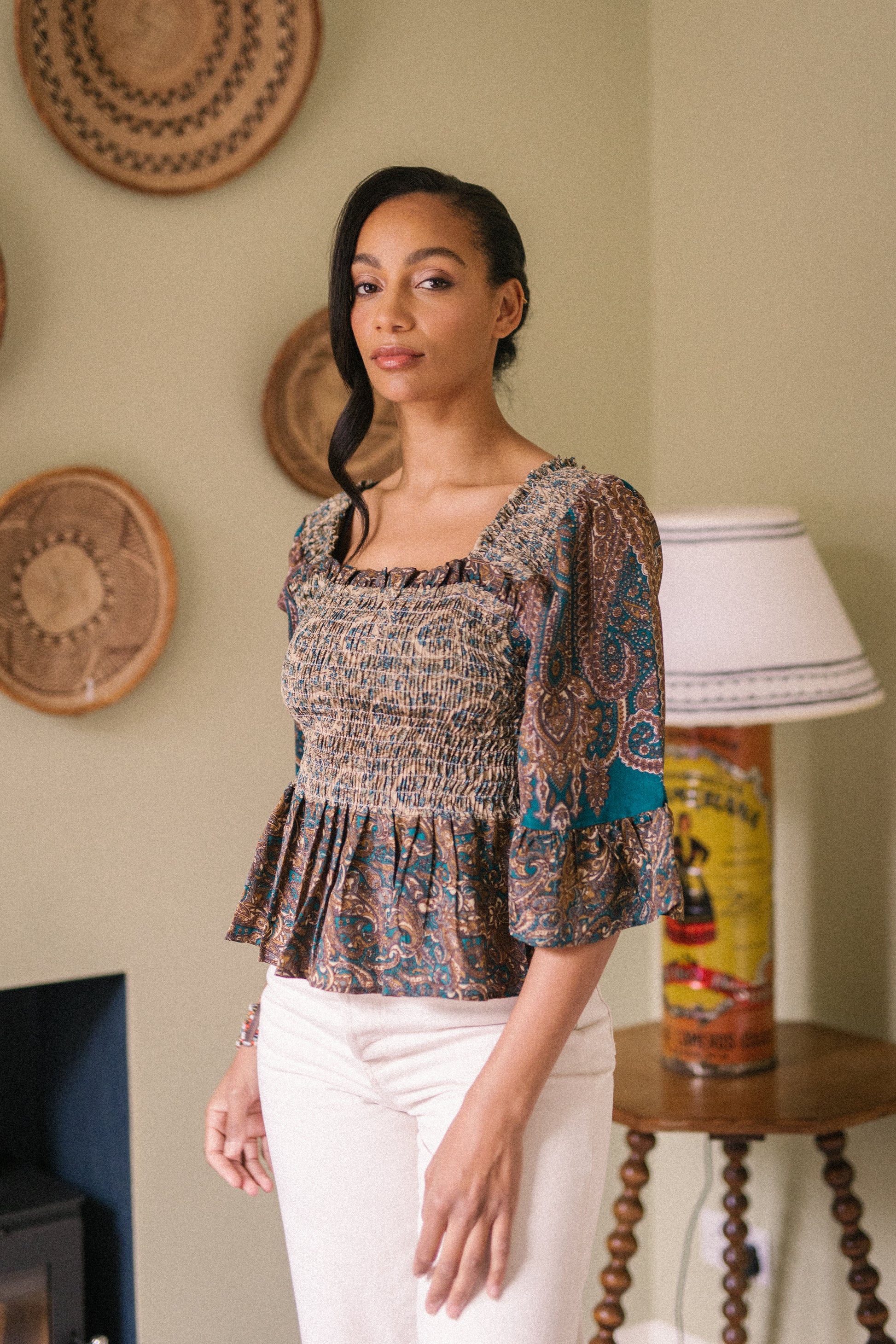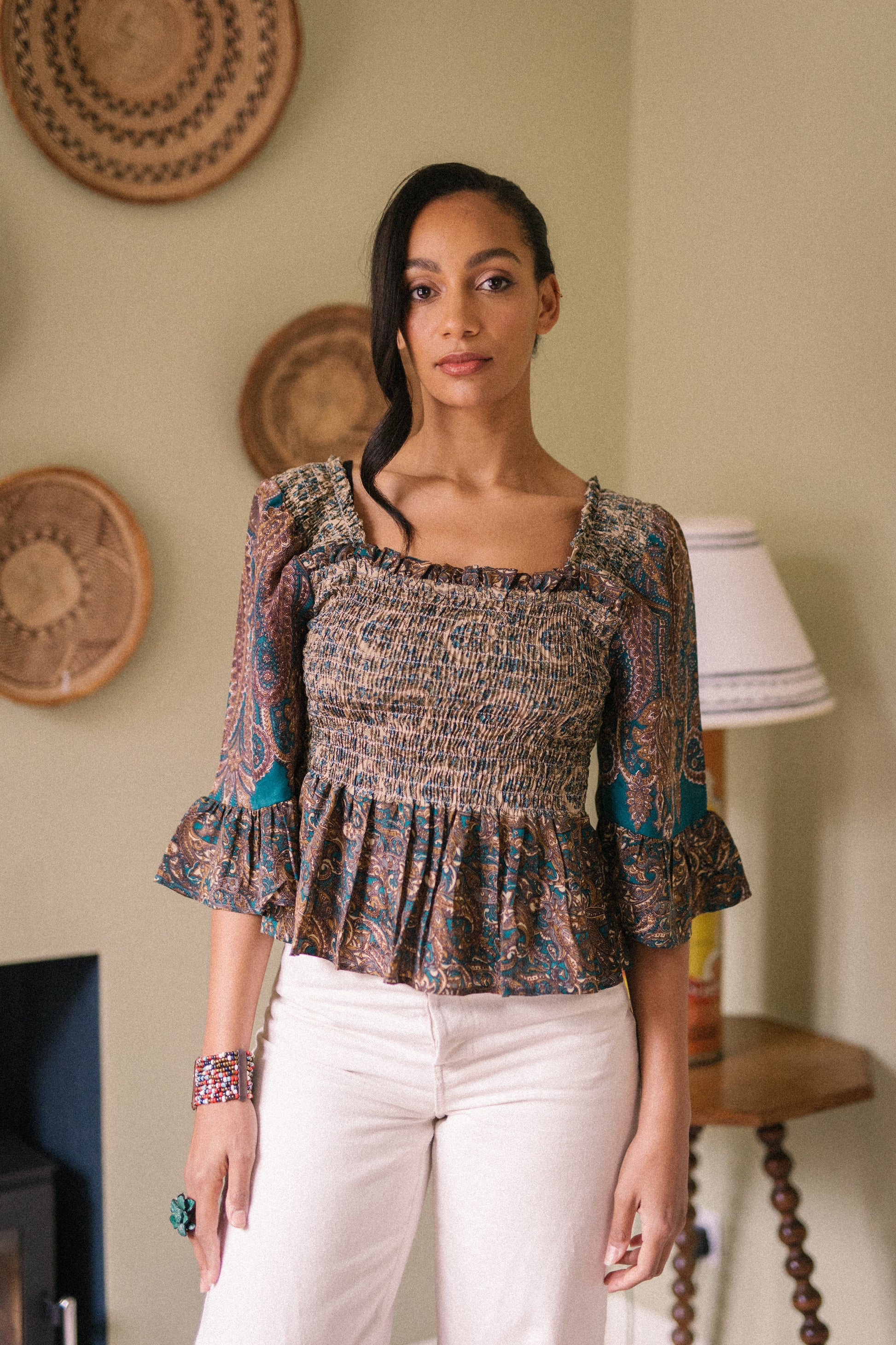 Joelyn is an elegant shirring smock silhouette with year around appeal. She has a smocked bodice, 3/4 length sleeves with a floaty ruffle cuff, a flattering Square neckline front and back with a peplum hem. Joelyn is hand crafted from Vintage up-cycled silk sari's.