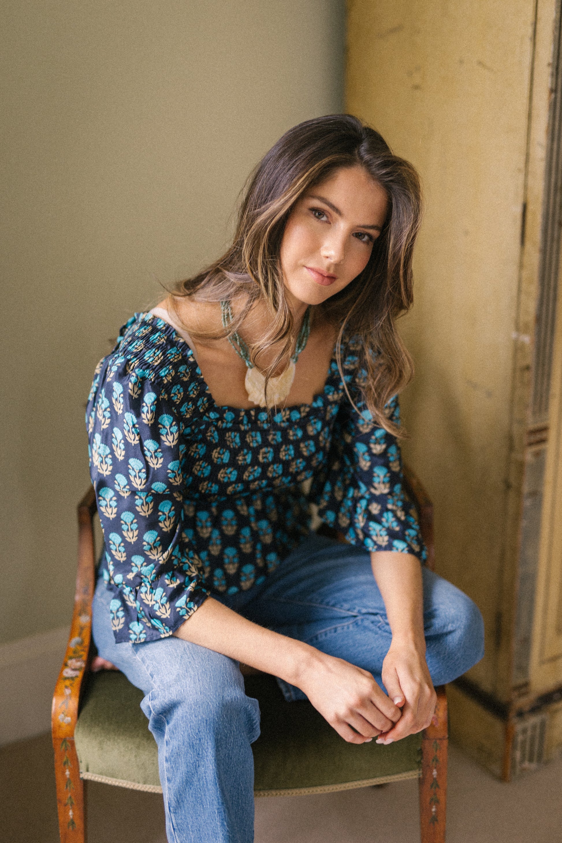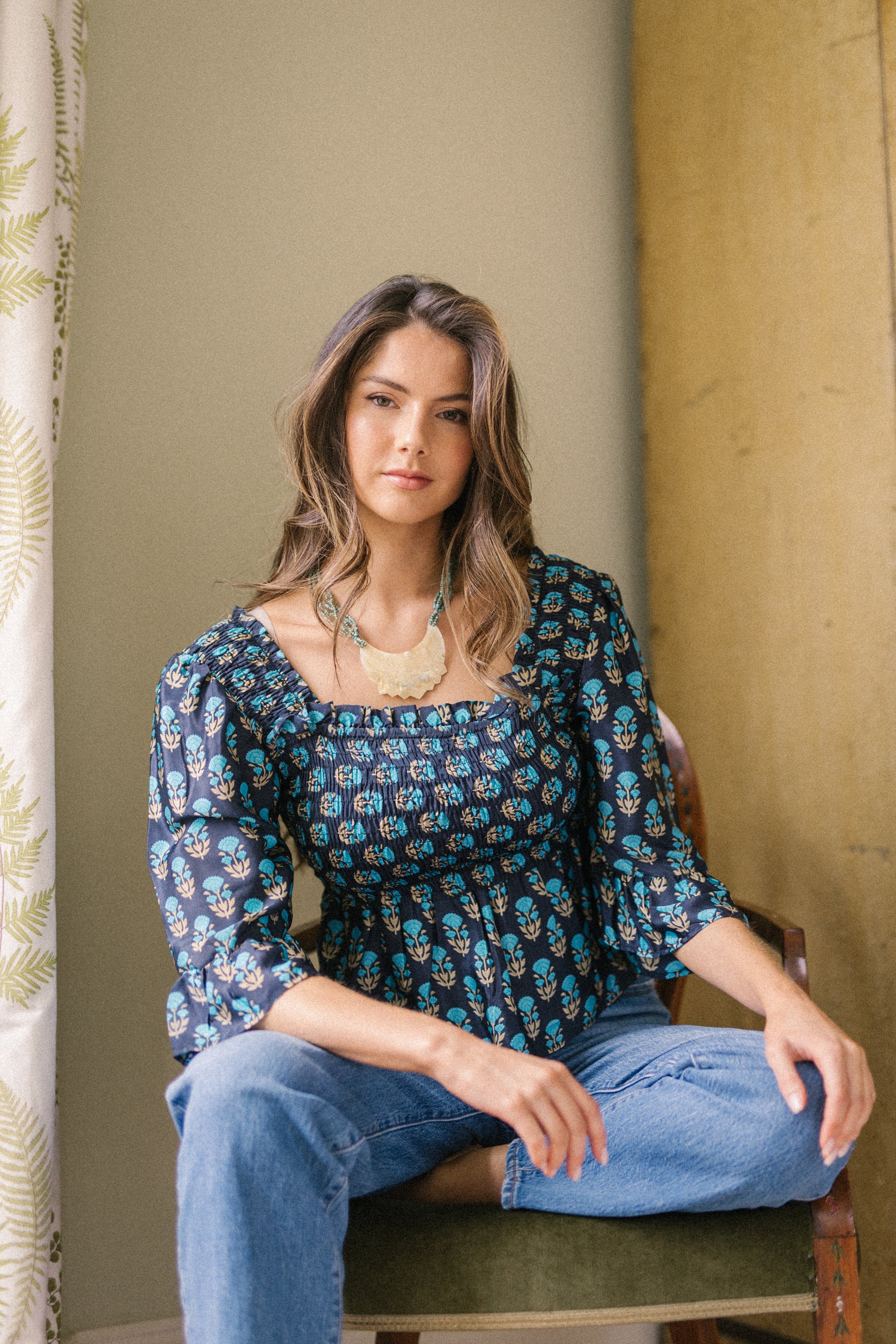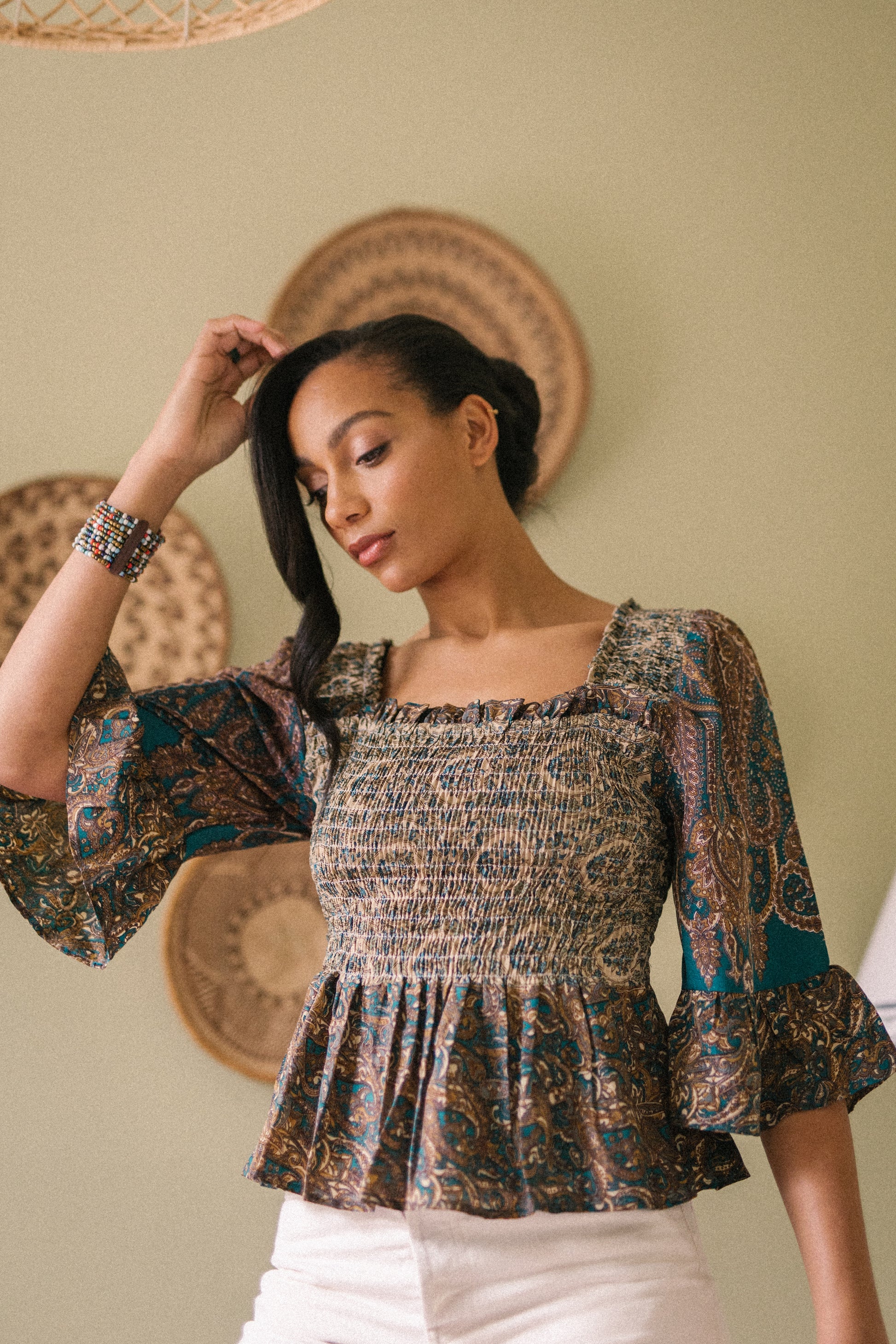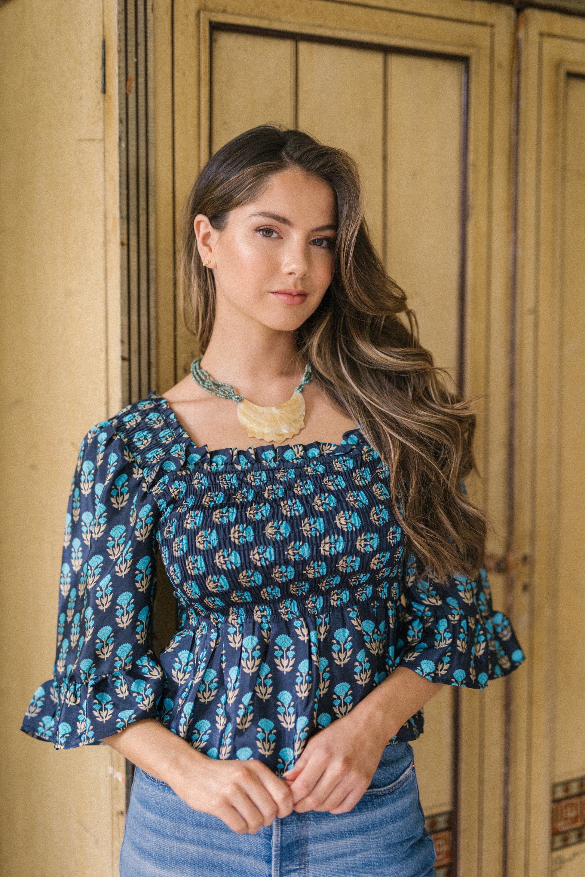 Joelyn is an elegant shirring smock silhouette with year around appeal. She has a smocked bodice, 3/4 length sleeves with a floaty ruffle cuff, a flattering Square neckline front and back with a peplum hem. Joelyn is hand crafted from Vintage up-cycled silk sari's.