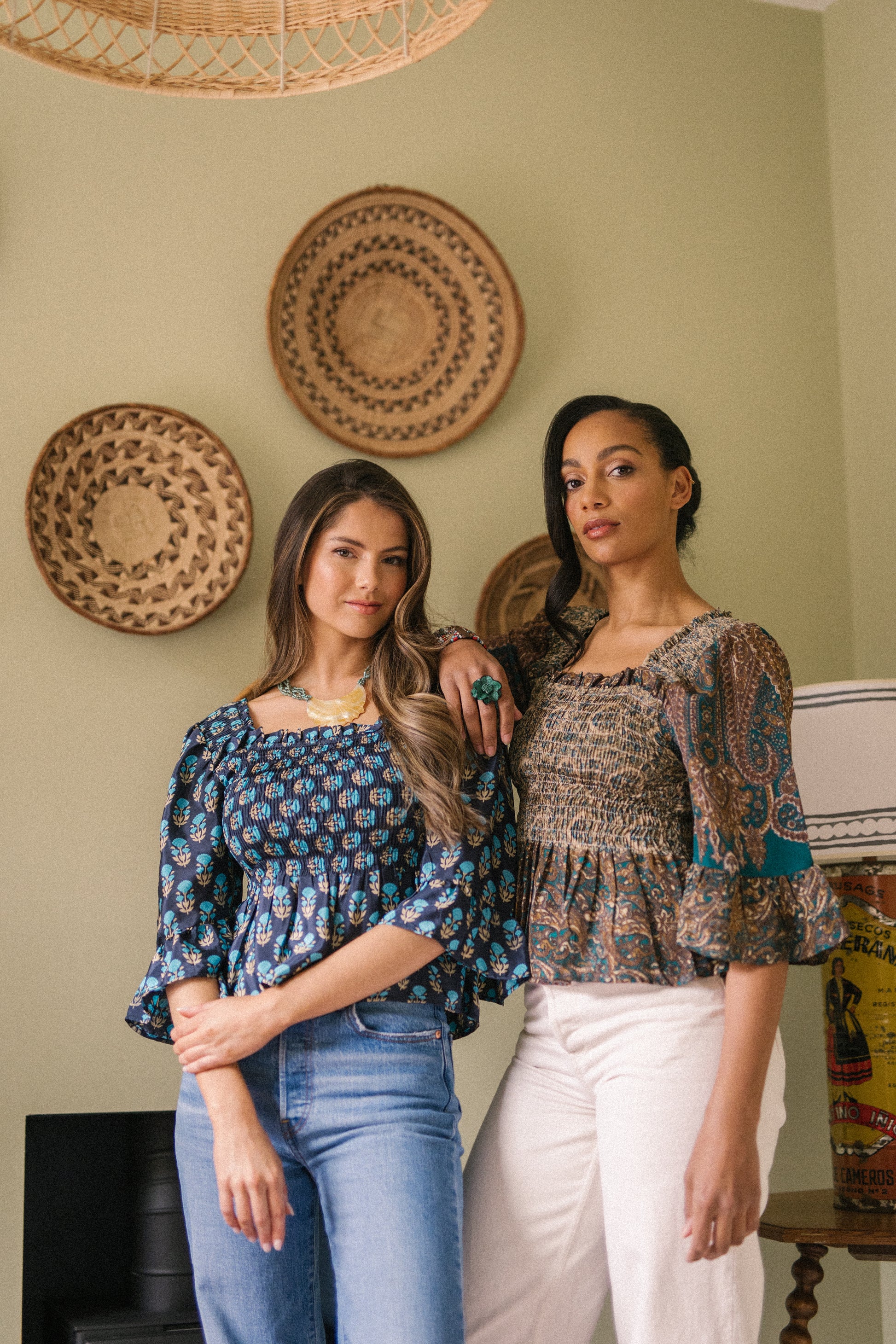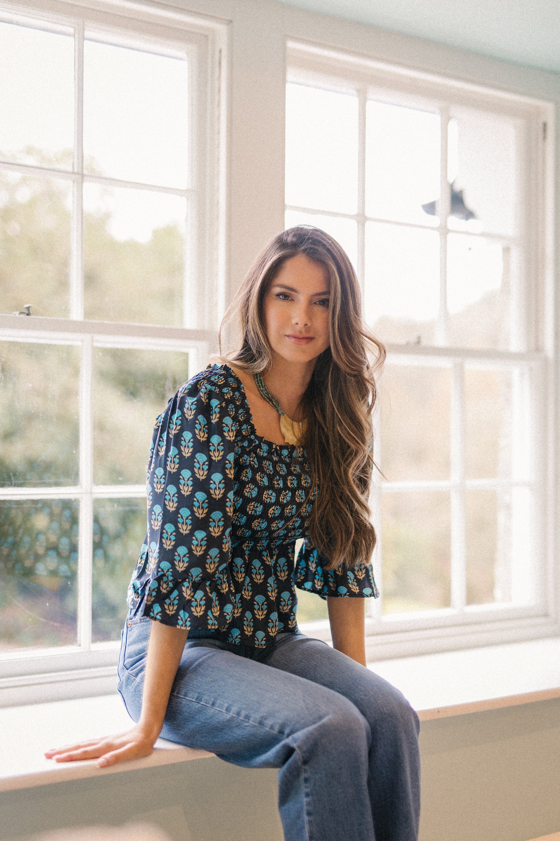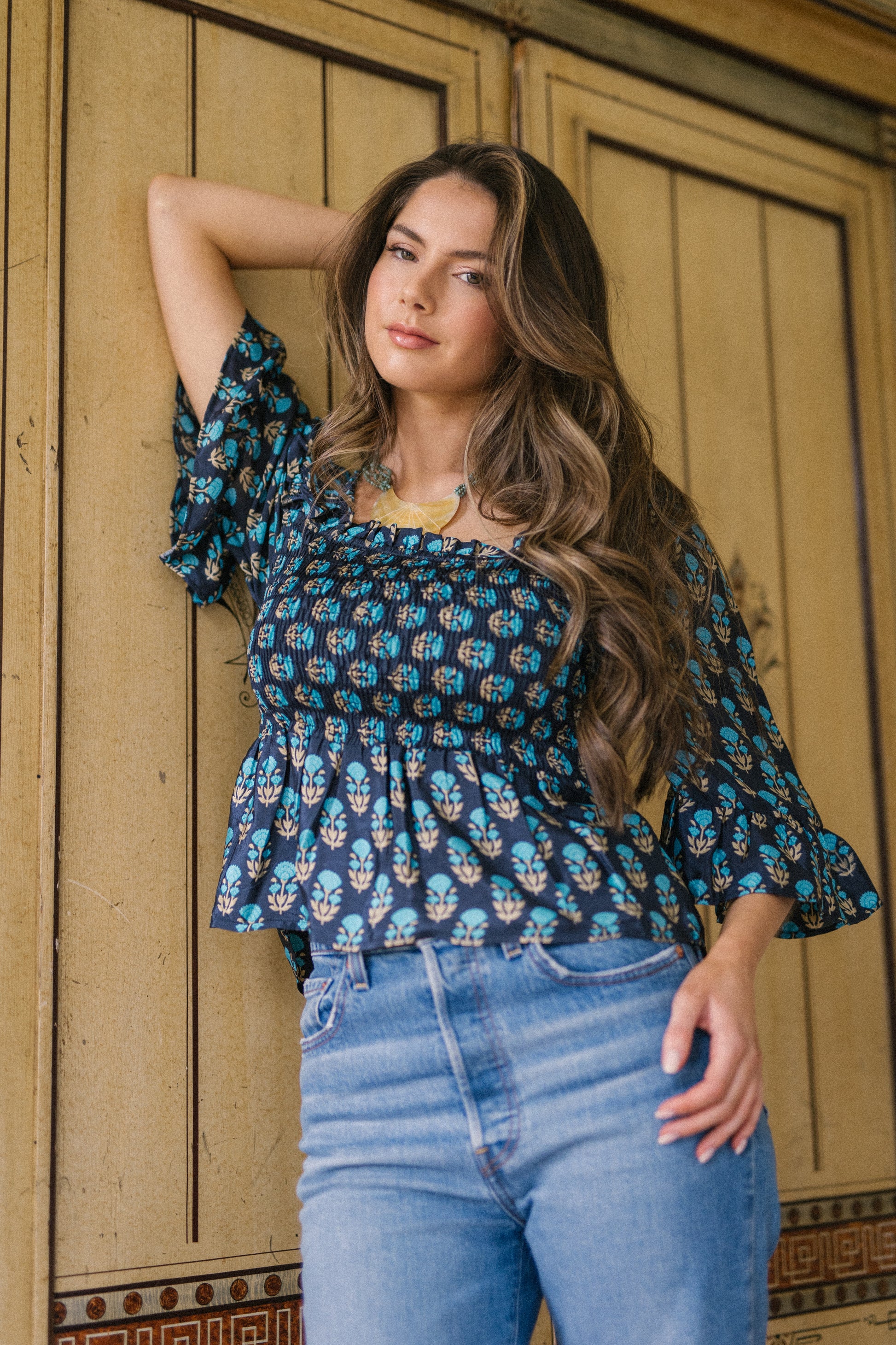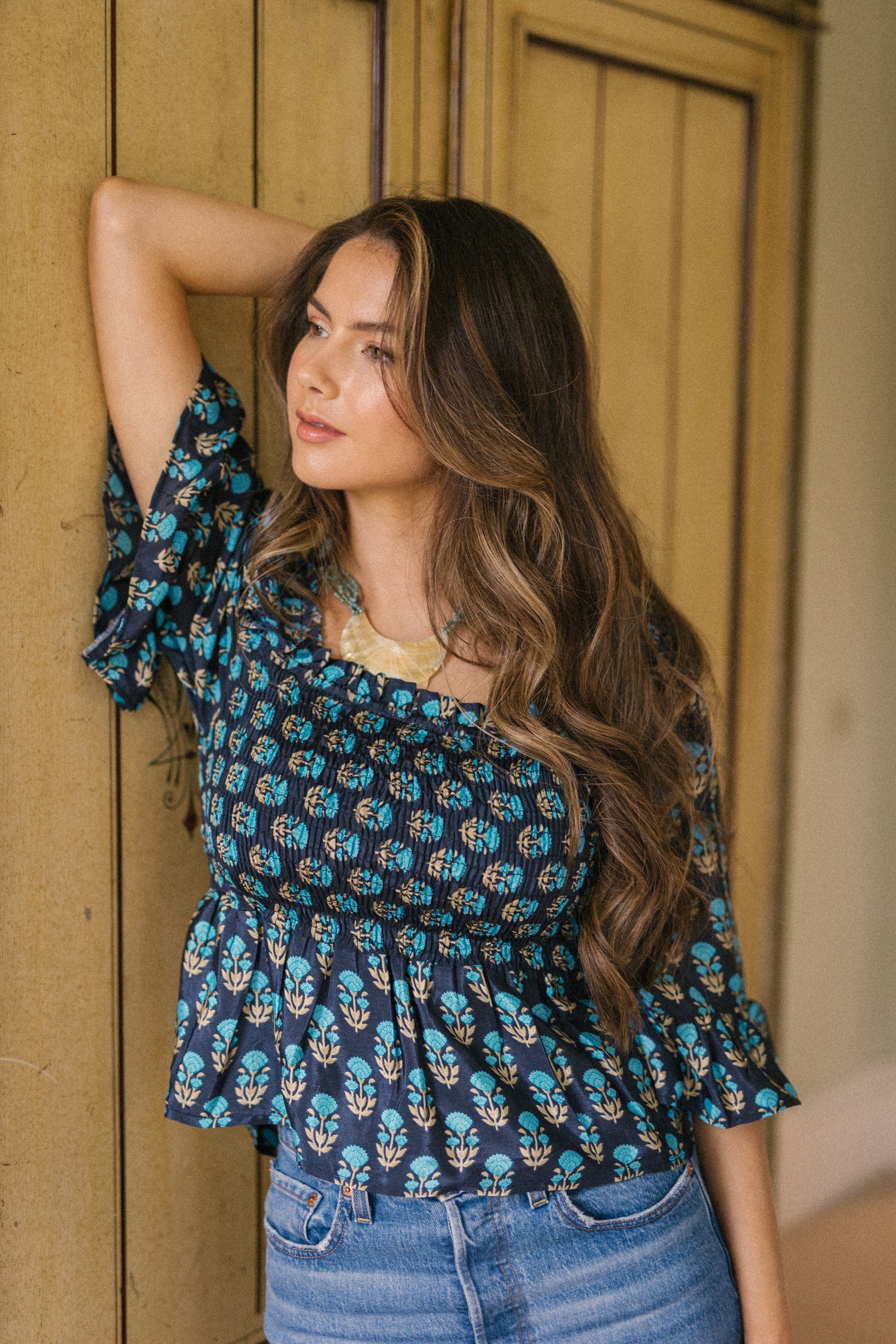 Joelyn is an elegant shirring smock silhouette with year around appeal. She has a smocked bodice, 3/4 length sleeves with a floaty ruffle cuff, a flattering Square neckline front and back with a peplum hem. Joelyn is hand crafted from Vintage up-cycled silk sari's.