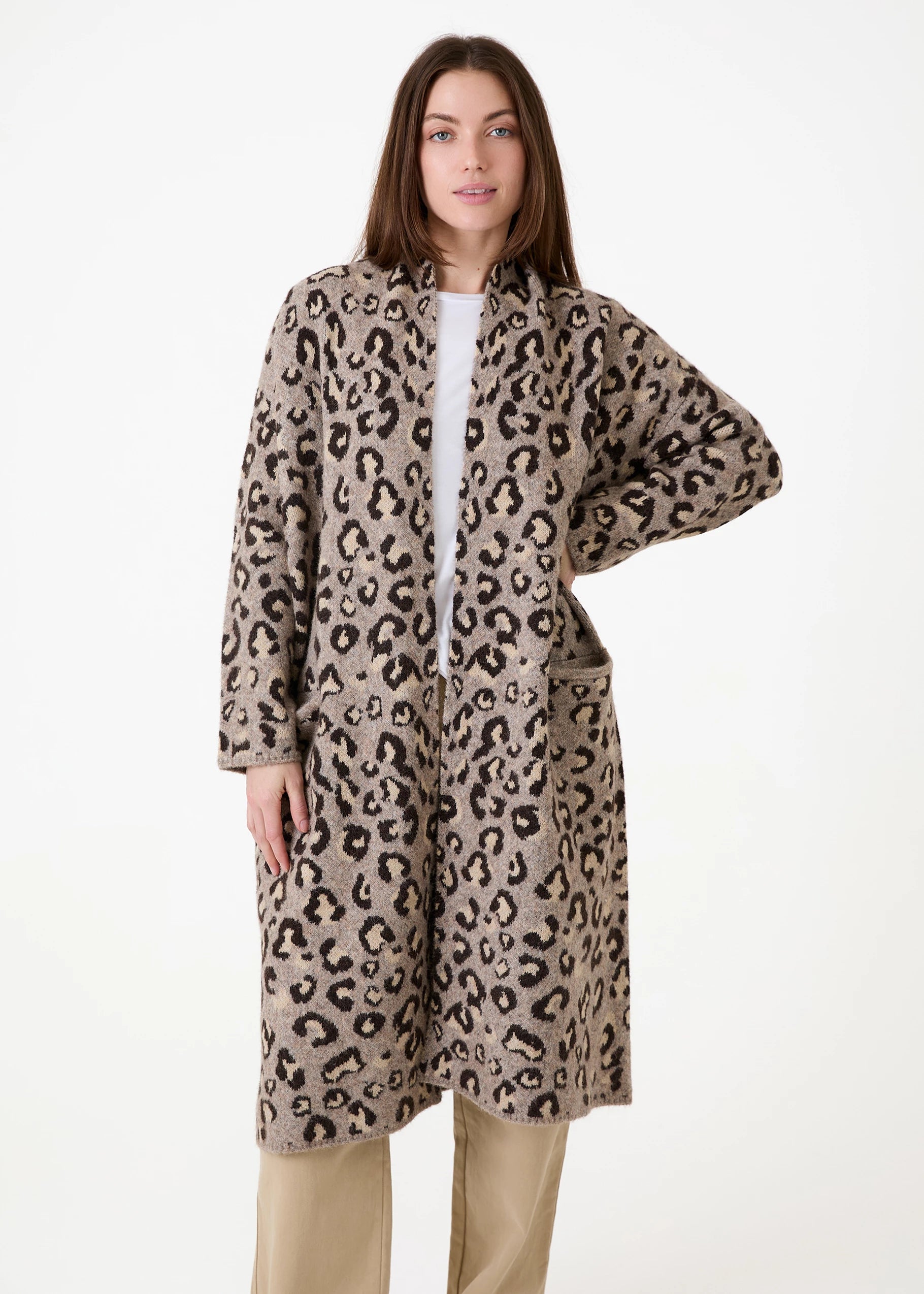 Soft Tweed Roll Collar Coatigan - Leopard Jacquard