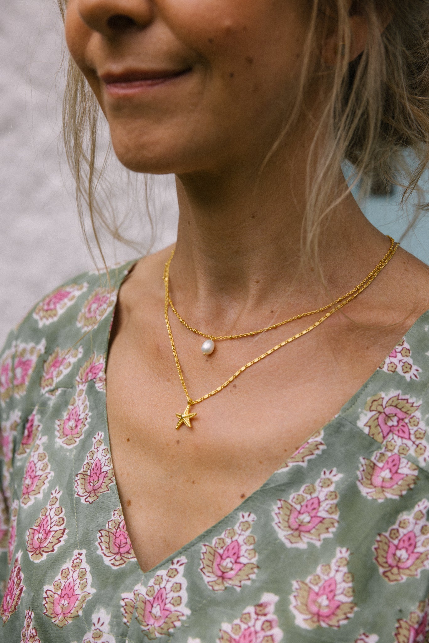 Embody the magic of the sea with this starfish & pearl necklace, a stunning tribute to the beauty and wonder of the ocean. This necklace is a true work of art, carefully crafted to evoke the beauty and mystery of the sea. For the girl that dreams of clear waters and white sandy beaches, this utterly irresistible pearl & starfish charm necklace is meant for you, she offers everyday simplicity and charm to every outfit.