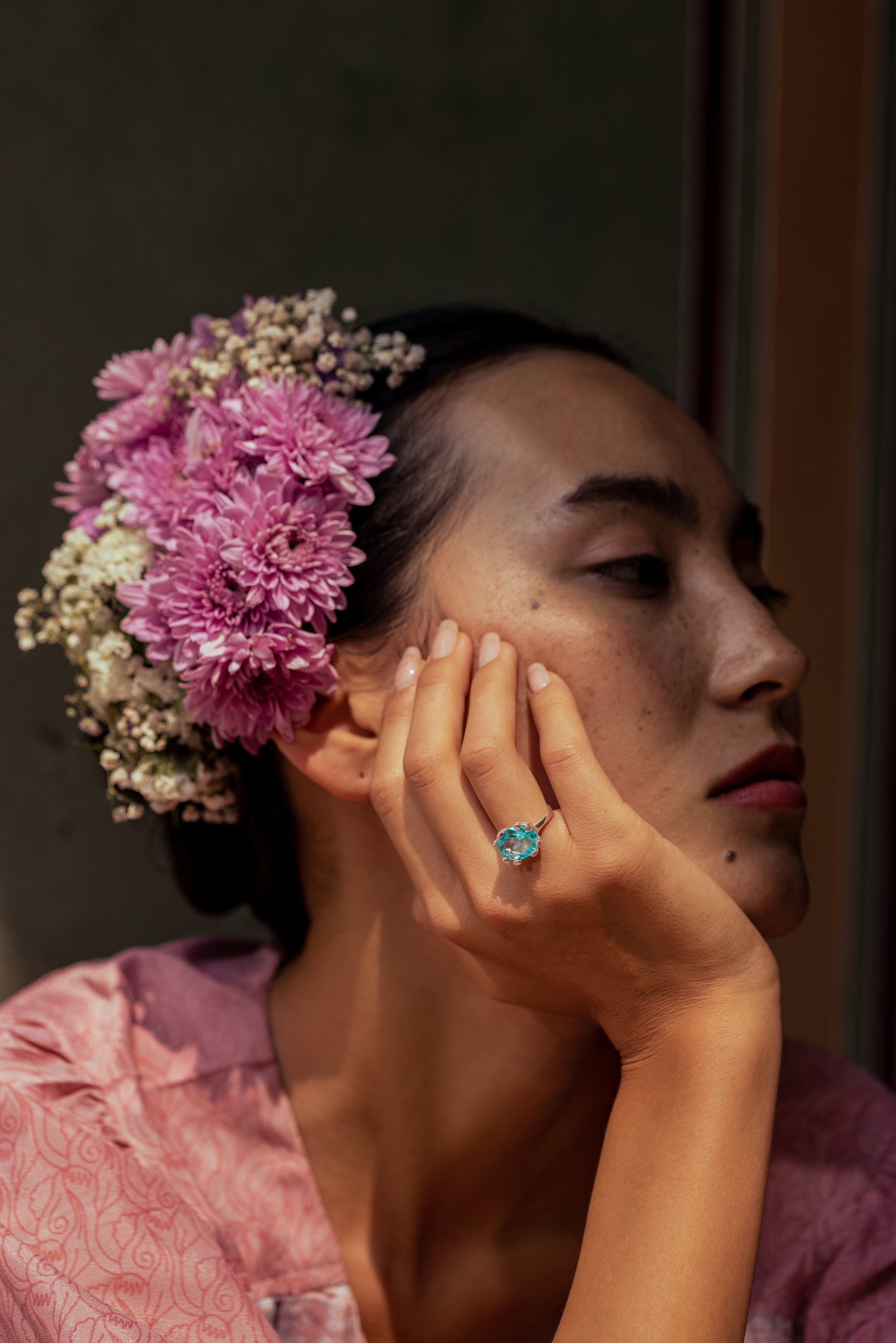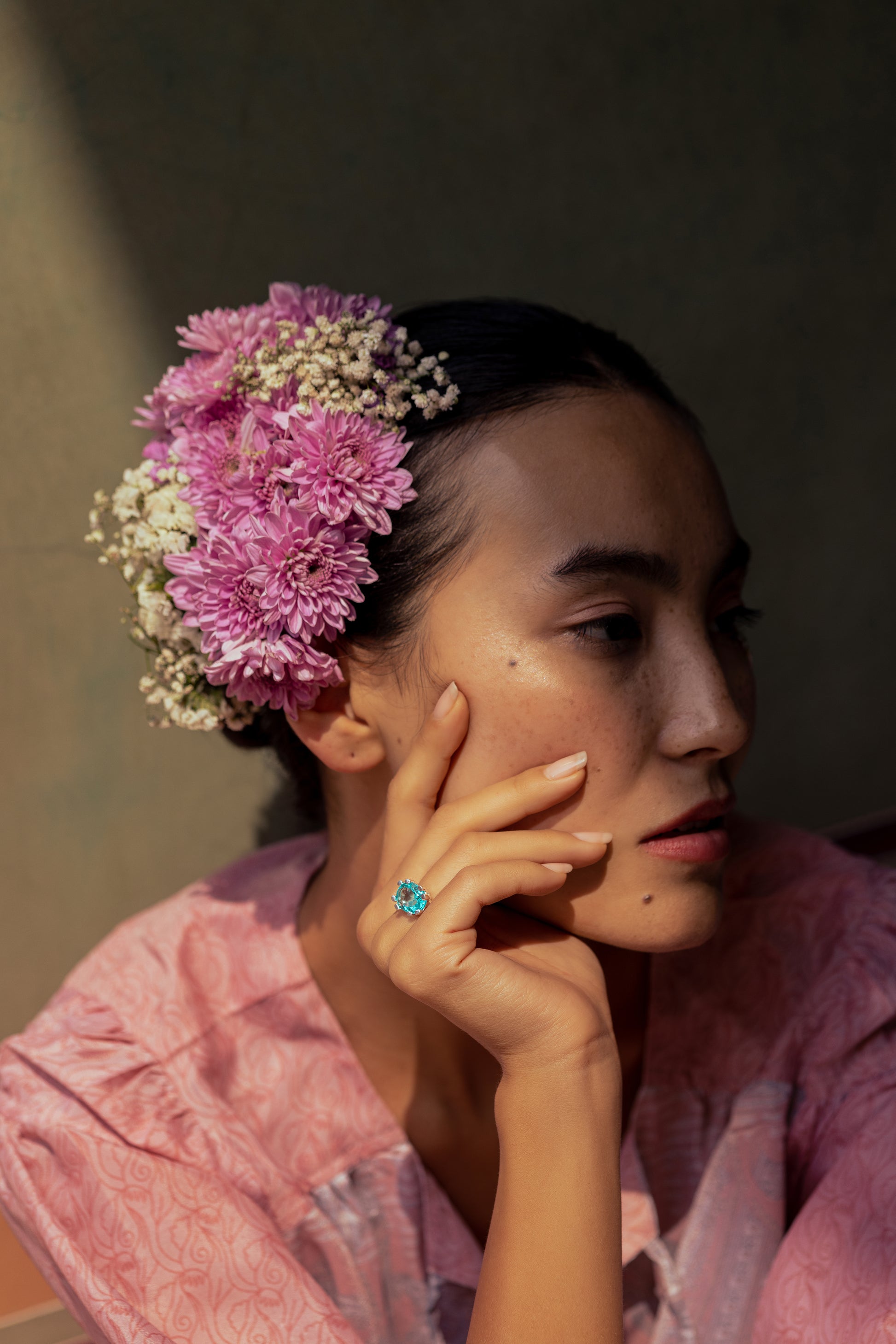This beautifully bold and statement cocktail ring is hand set with a multi oval faceted blue Topaz cut glass in a 8 claw prong on a Sterling Silver. Simple ,yet elegant, this solitaire ring is all about timeless beauty. The simplicity of the base in coordination with the glamour of the oversized crystal, makes this a beautiful, instant classic. Wear her solo for everyday elegance threw the day and into the evening.