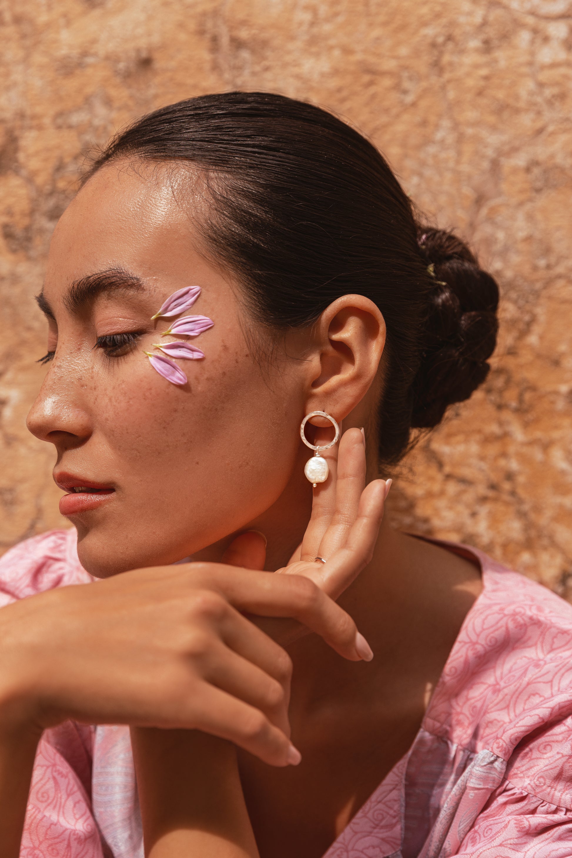 The circled earring has been hand hammered and has a natural fresh water pearl attached, each piece will be unique due to the item being hand crafted by Artisans.