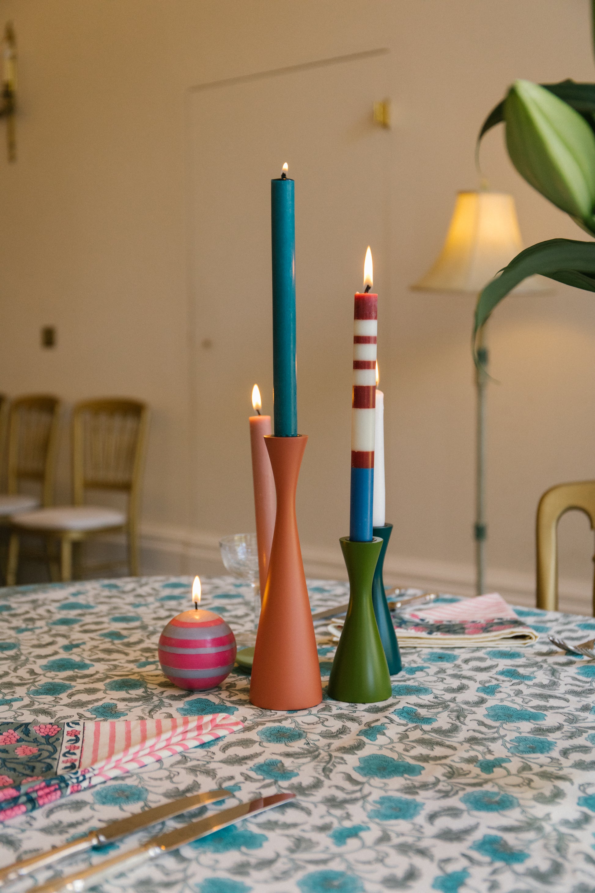 An elegant, simple turned and painted wooden candleholder in a British Colour Standard colour to set the table in style.