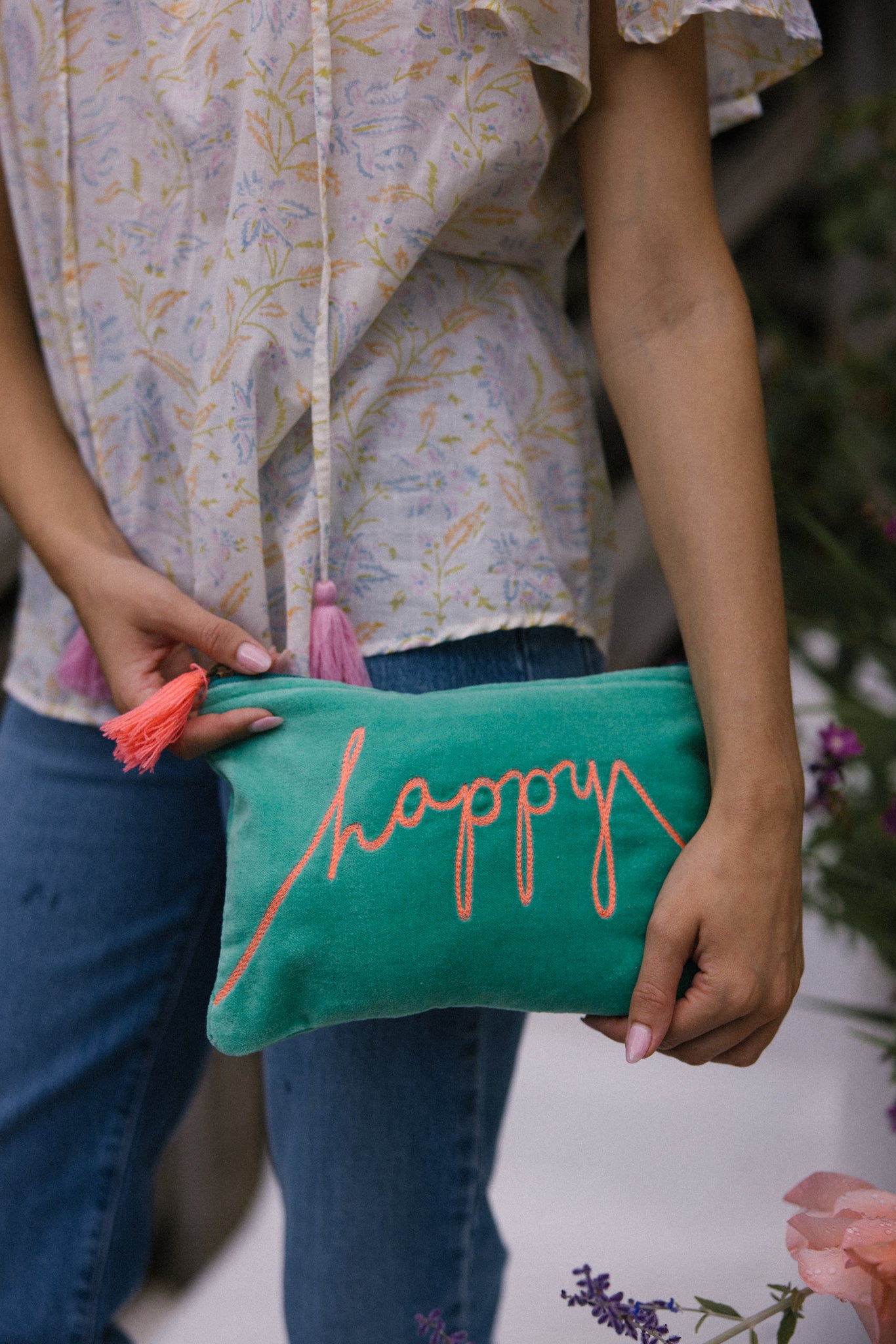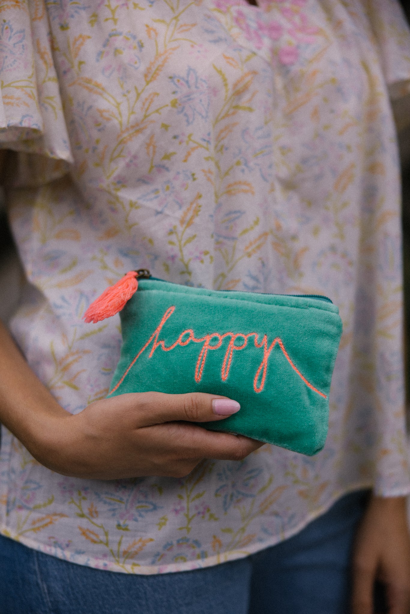 . Velvet Happy pattern pouch with stitched detail and tassel on zip