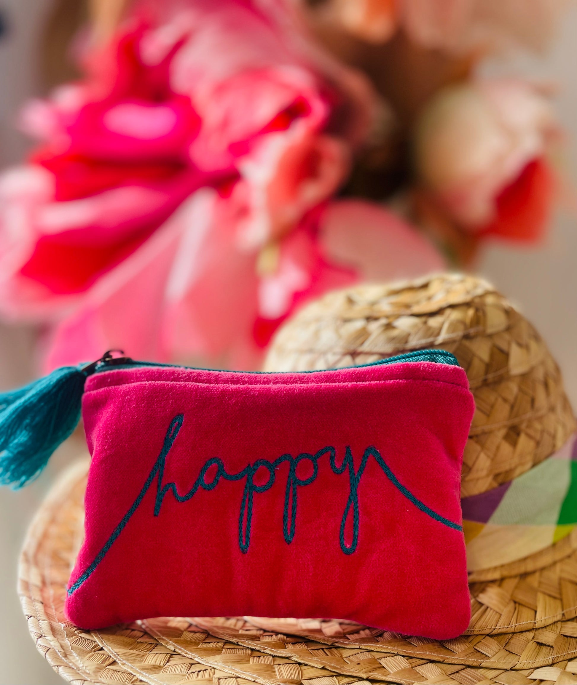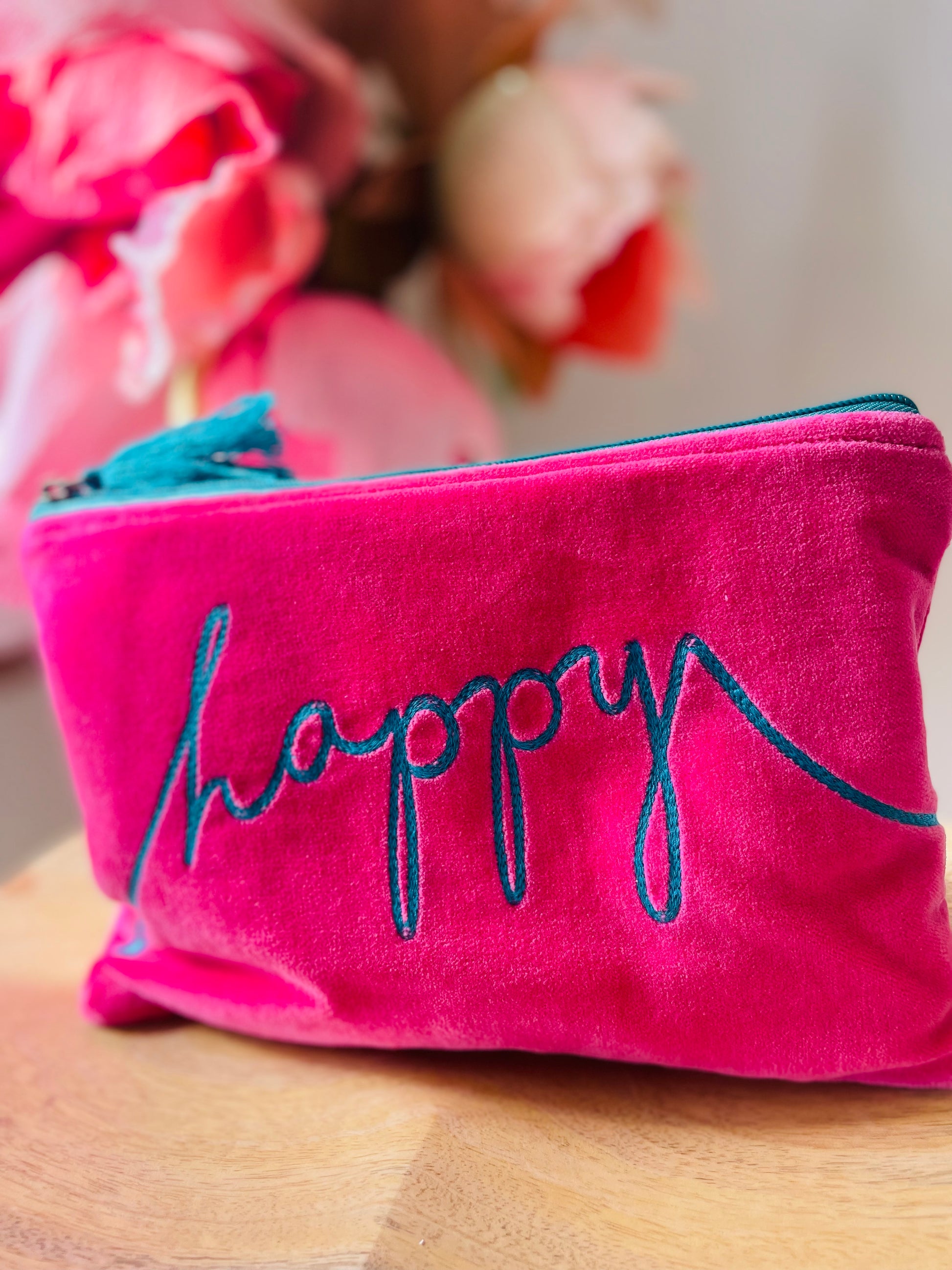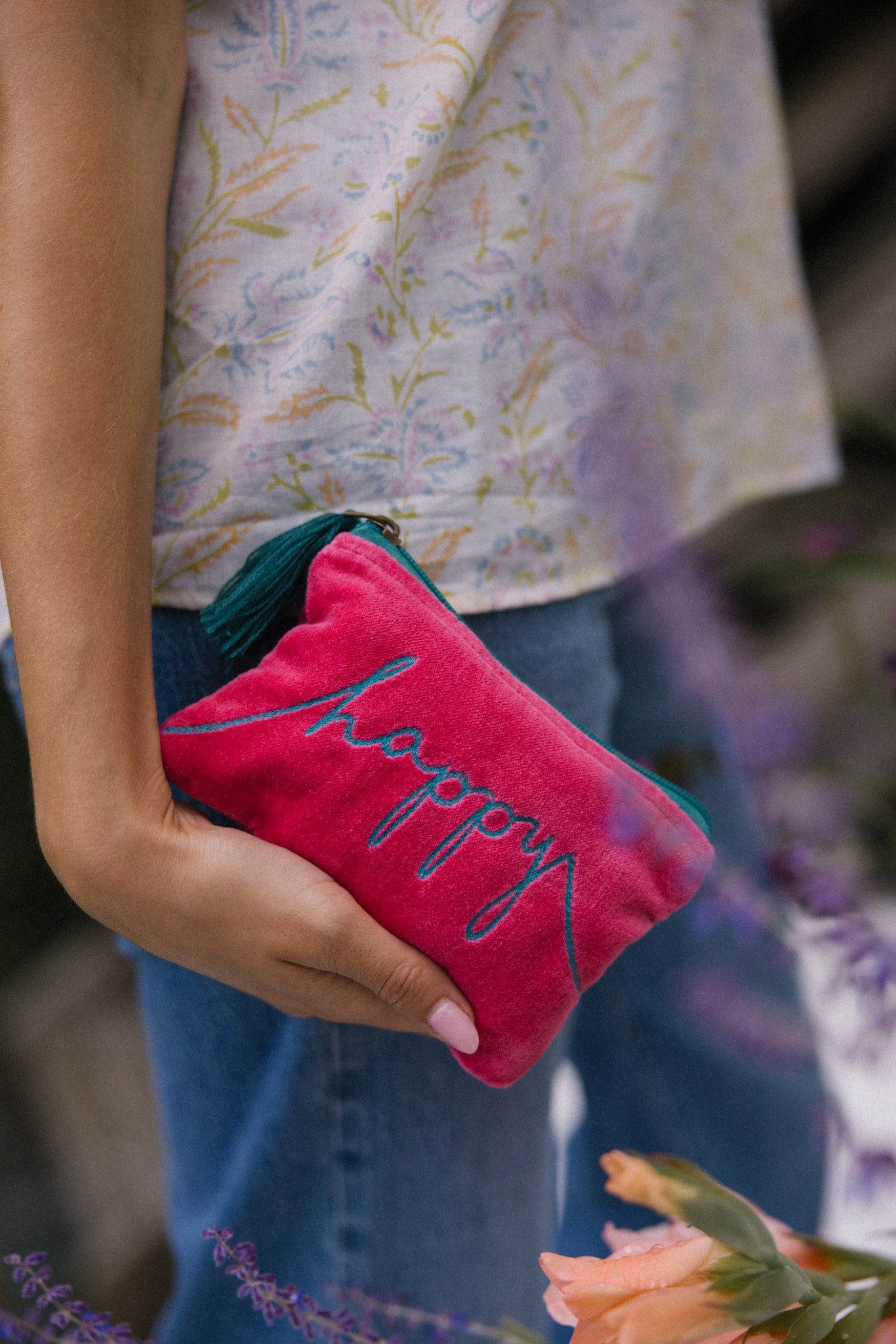 . Velvet Happy pattern pouch with stitched detail and tassel on zip