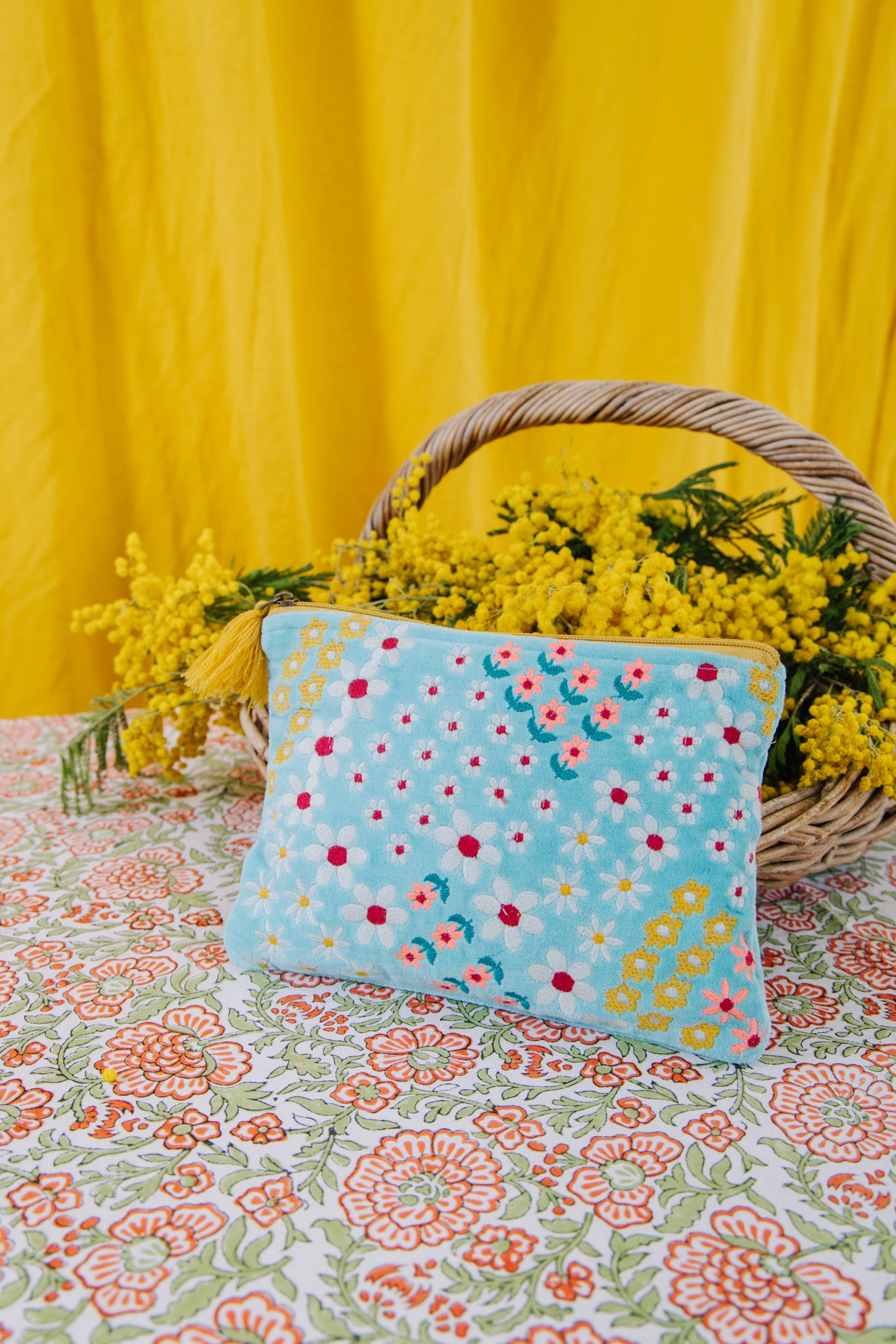 . Velvet Meadow patterned pouch with stitched detail and tassel on zip
