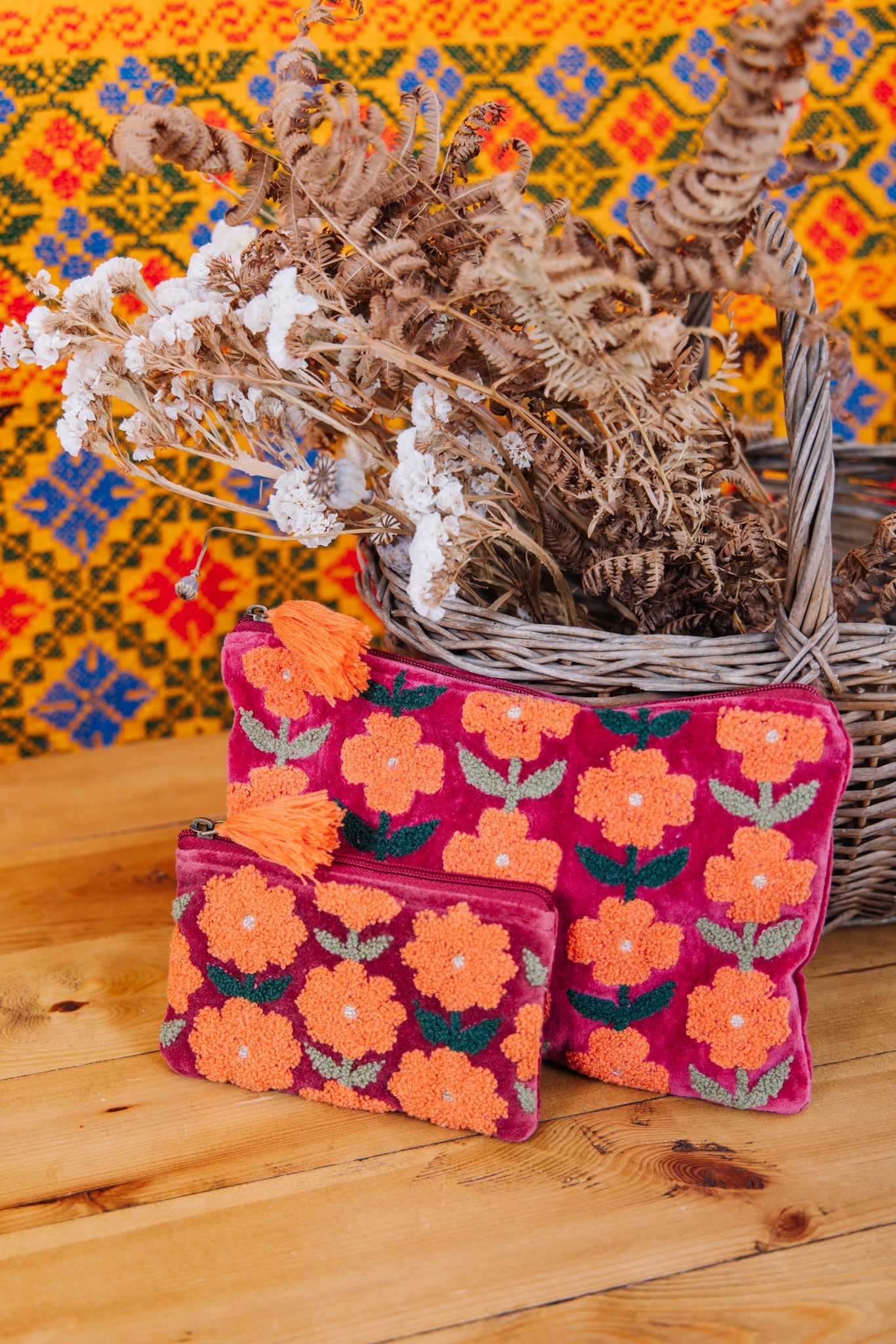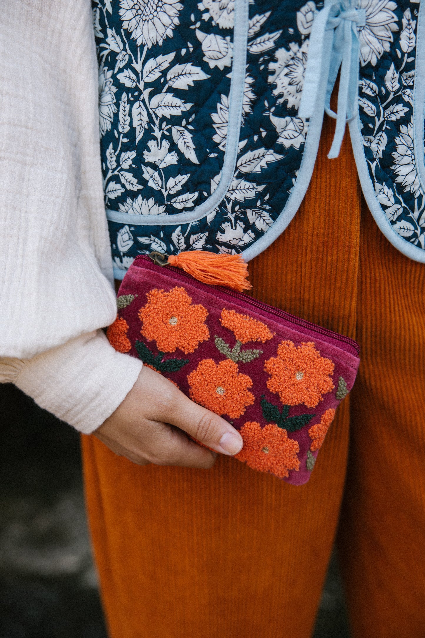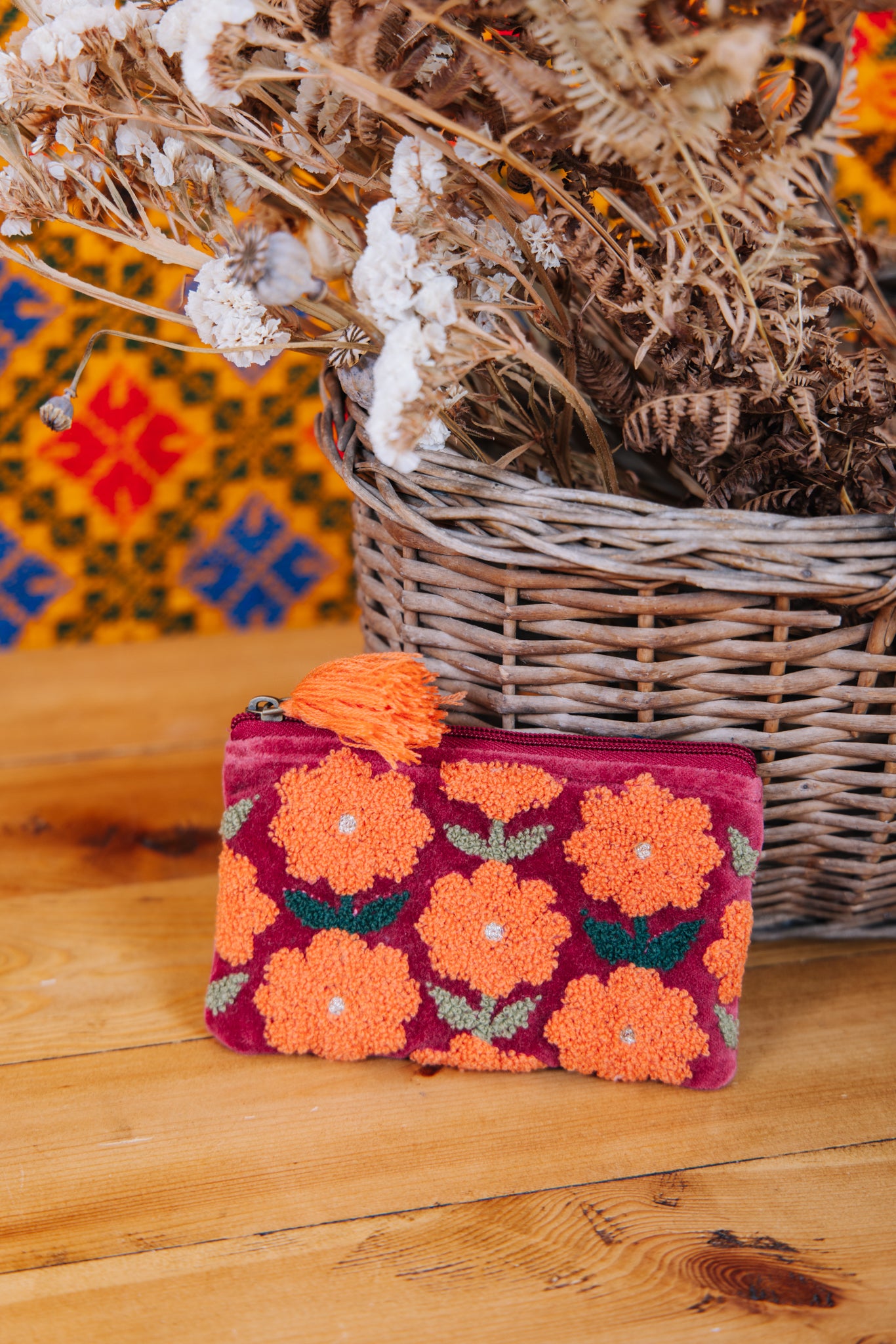 . Velvet Multi Flower patterned pouch with stitched detail and tassel on zip