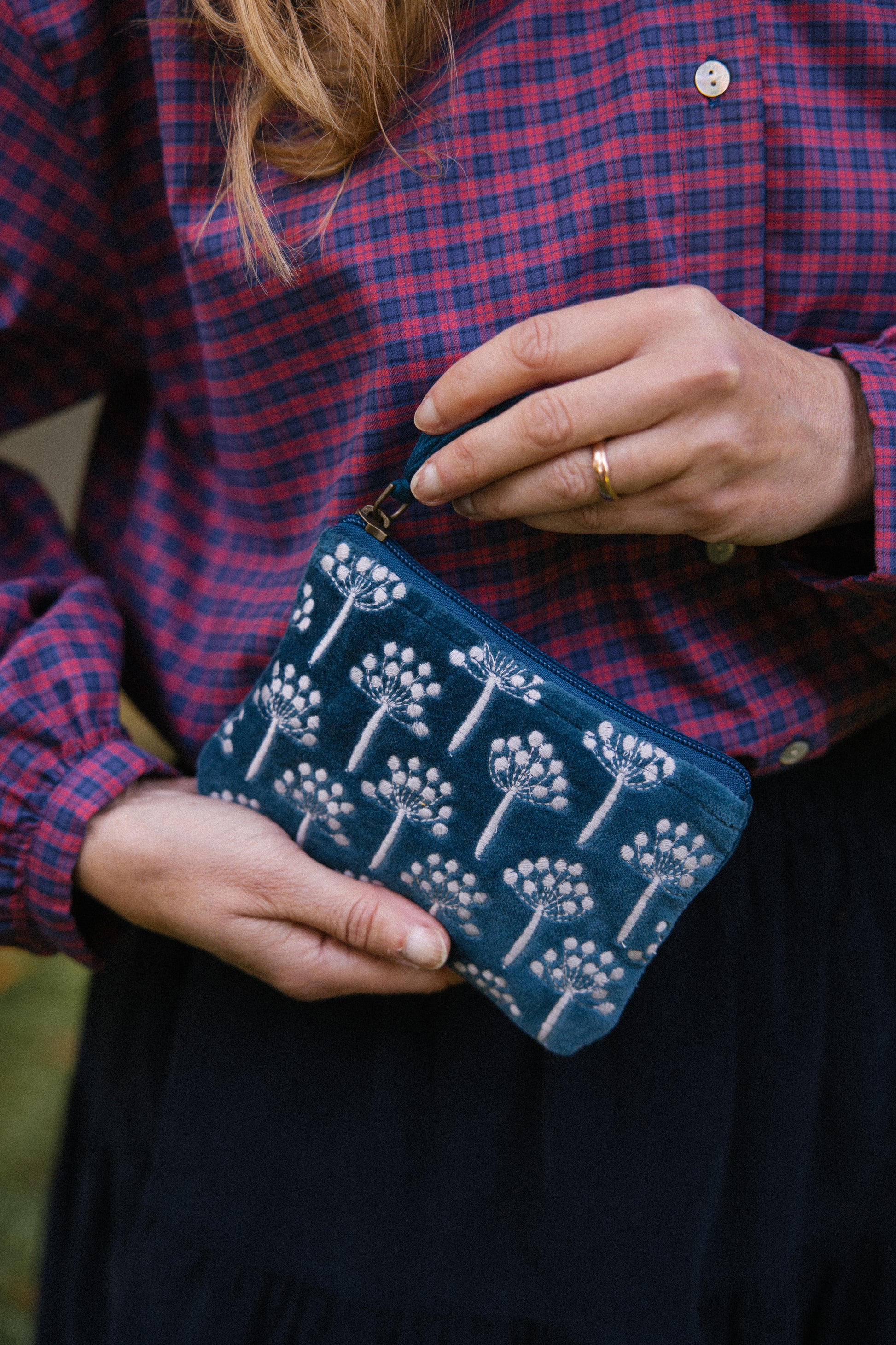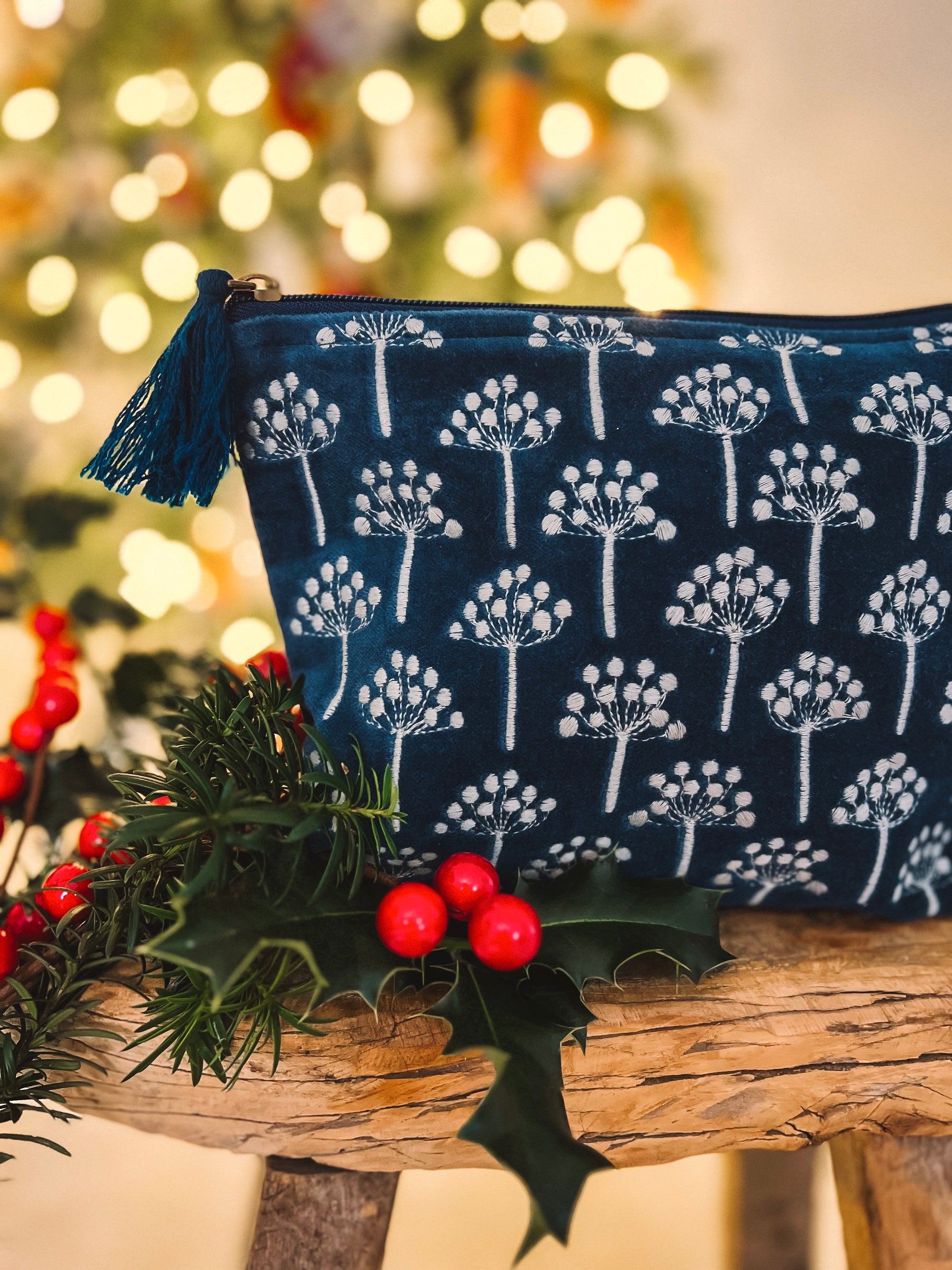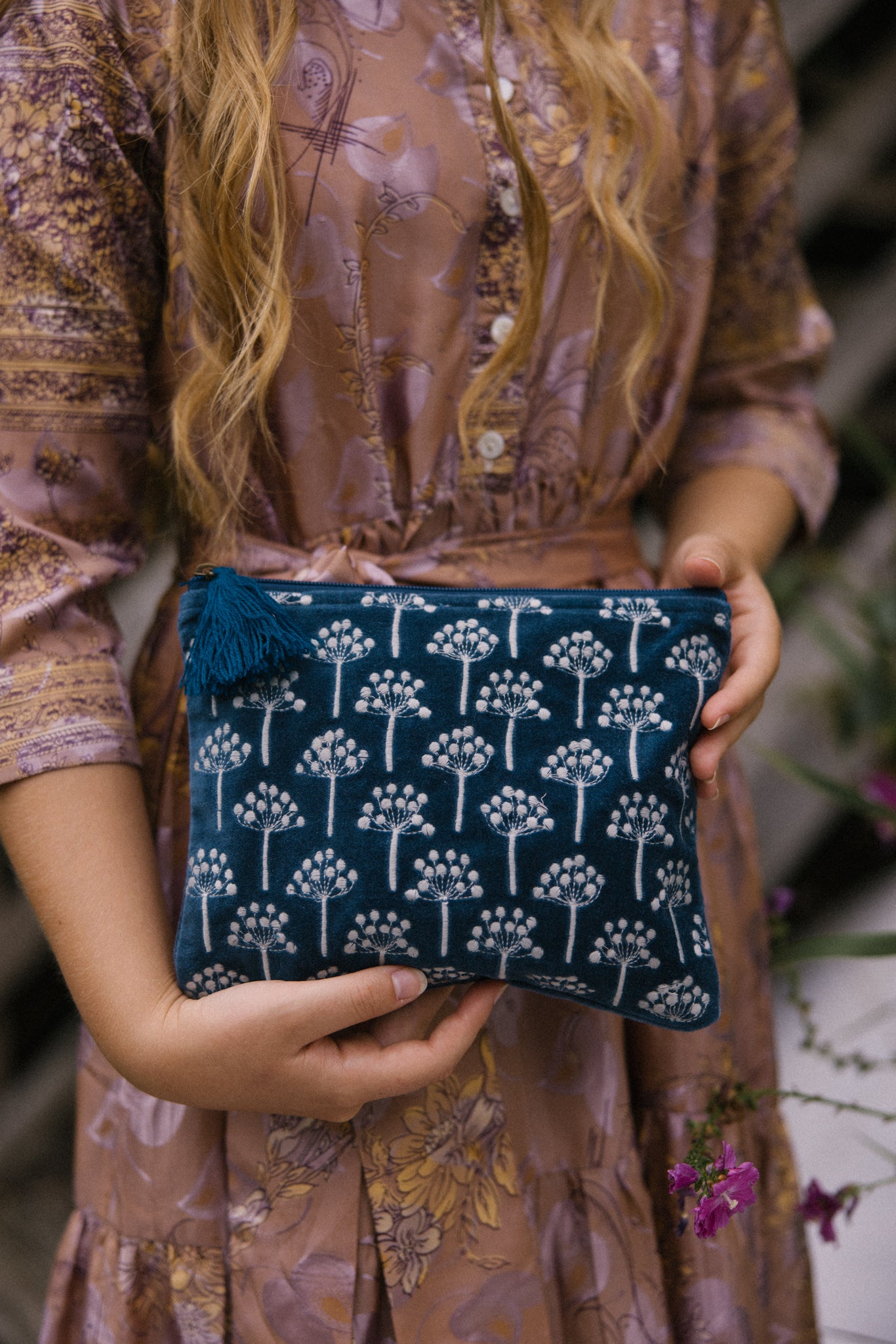 . Velvet Thistle patterned pouch with stitched detail and tassel on zip