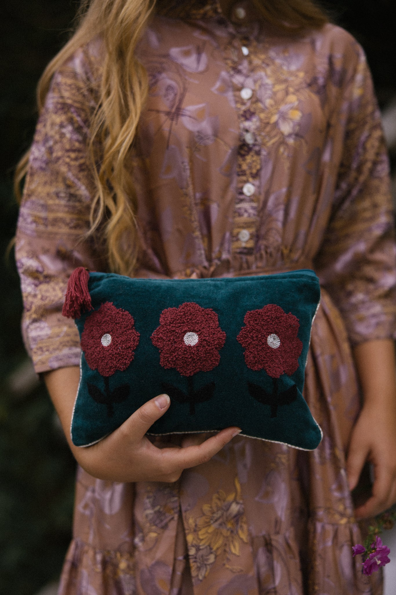 . Velvet Triple Flower patterned pouch with stitched detail and tassel on zip